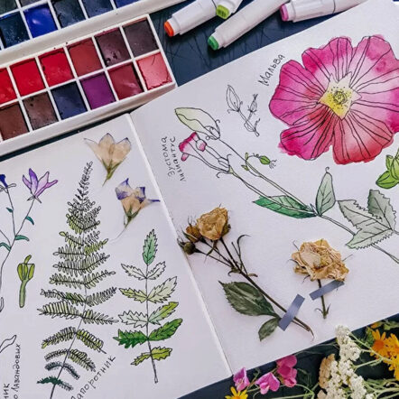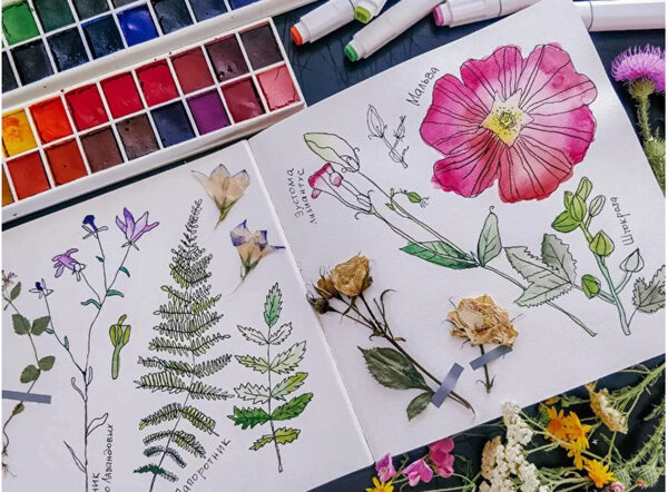 На курсе вы освоите несколько техник, несколько видов графики, и в дальнейшем сможете сами заполнять свои альбомы и блокноты.