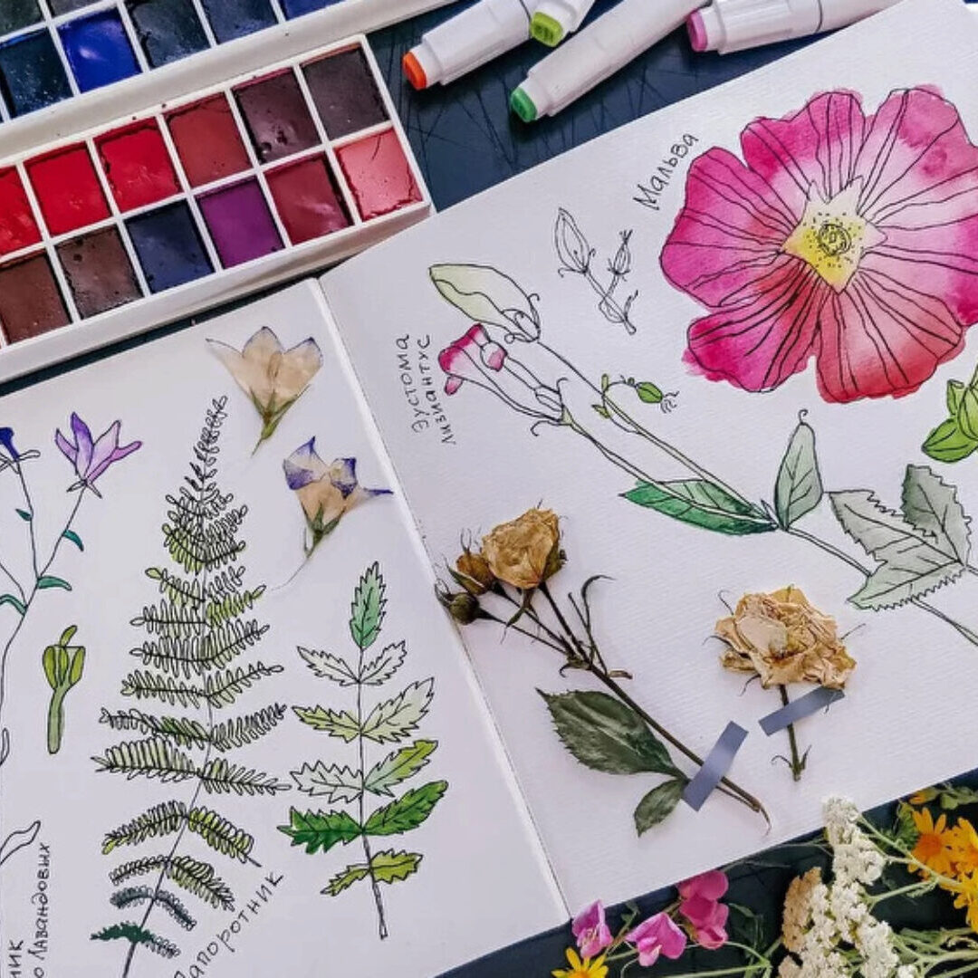 Помимо изучения тем окружающего мира будем осваивать композицию и новые техники Дополнительный иллюстративный материал. 4 красивых разворота в скетчбуке + отдельная творческая работа Материалы: Скетчбук без пружины (лучше квадратный), плотность бумаги не меньше 200 гр Акварельная бумага А4 Простой