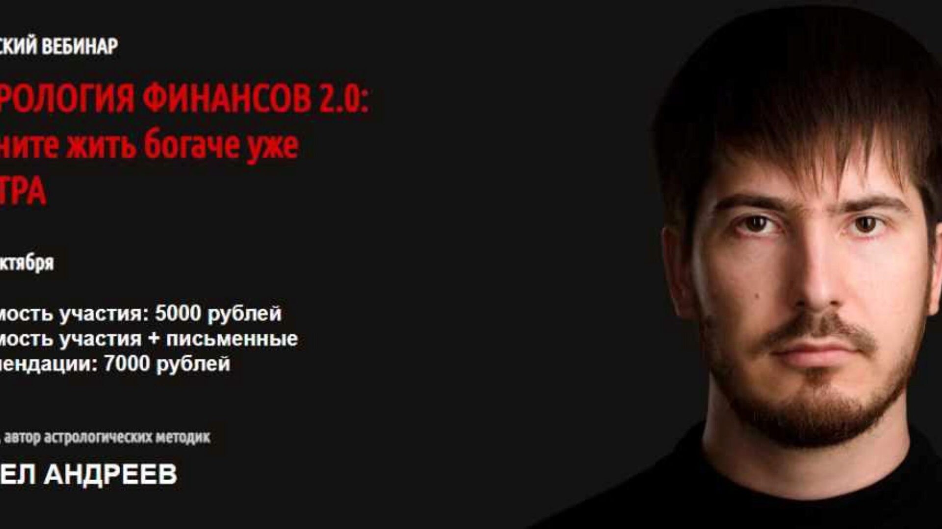 АСТРОЛОГИЯ ФИНАНСОВ 2.0: начните жить богаче уже завтра Автор - ПАВЕЛ АНДРЕЕВ УНИКАЛЬНЫЙ СЕМИНАР, КОТОРЫЙ СОЧЕТАЕТ ФОРМАТ ЛЕКЦИИ, ТРЕНИНГА И ПУБЛИЧНОЙ КОНСУЛЬТАЦИИ За два дня интенсивного астрологического погружения мы совместными усилиями: изготовим персональный план роста благосостояния для