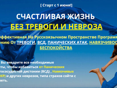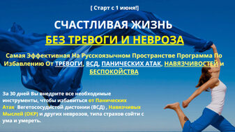 САМЫЙ ЭФФЕКТИВНЫЙ ОНЛАЙН ТРЕНИНГ НА РУССКОЯЗЫЧНОМ ПРОСТРАНСТВЕ За 30 дней Вы внедрите все необходимые инструменты, чтобы избавиться от Панических Атак, Вегетососудистой дистонии (ВСД) Навязчивых Мыслей (ОКР) и других неврозов, типа страхов сойти с ума и умереть. К ЗДОРОВОЙ ЖИЗНИ «Счастливая жизнь