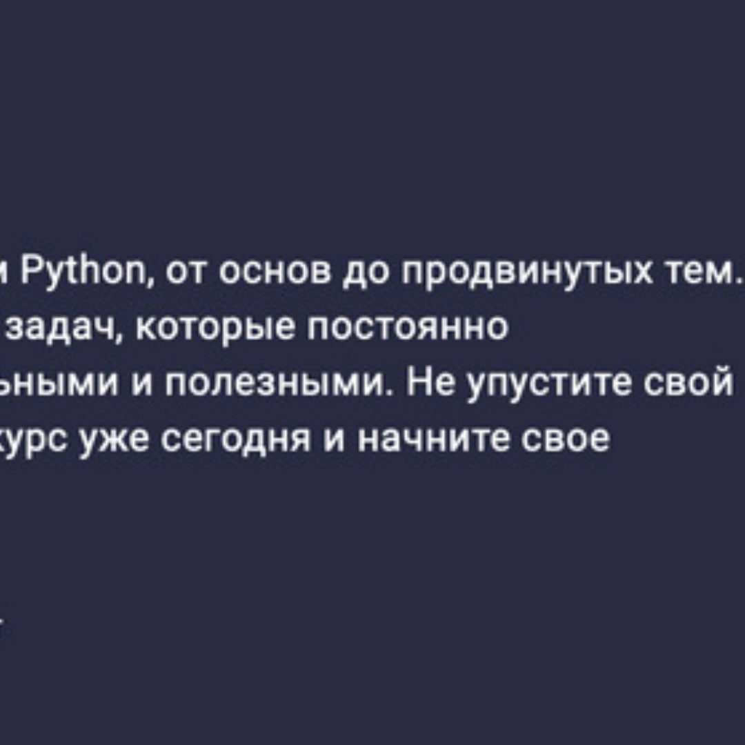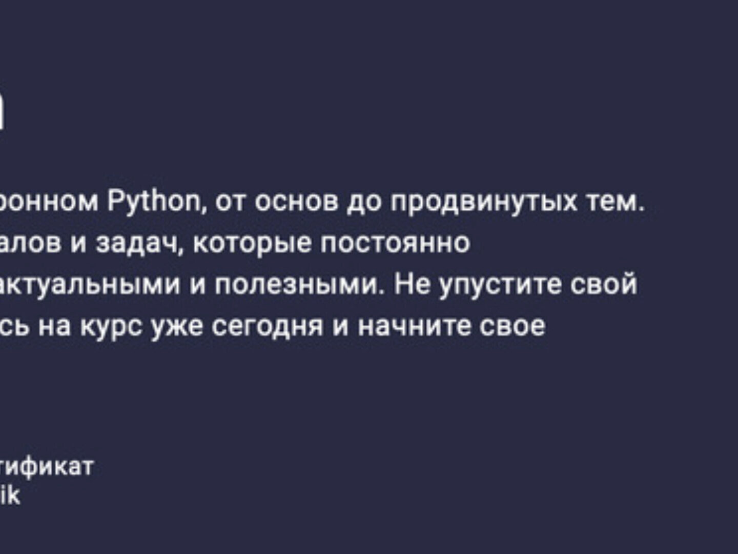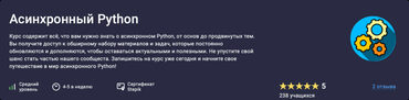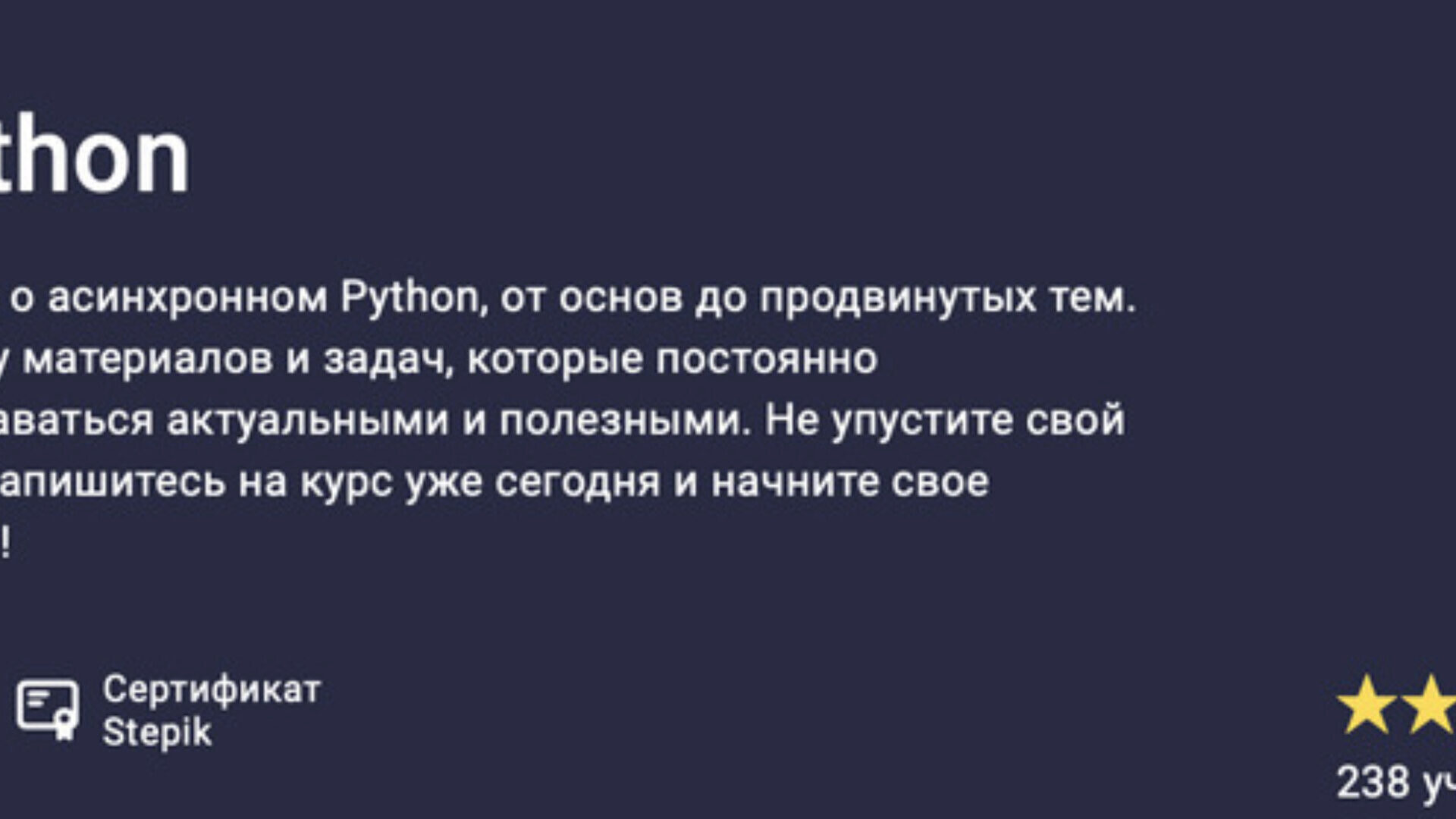 Курс содержит всё, что вам нужно знать о асинхронном Python, от основ до продвинутых тем. Вы получите доступ к обширному набору материалов и задач, которые постоянно обновляются и дополняются, чтобы оставаться актуальными и полезными. Не упустите свой шанс стать частью нашего сообщеста. Запишитесь на курс уже сегодня и начните свое путешествие в мир асинхронного Python!