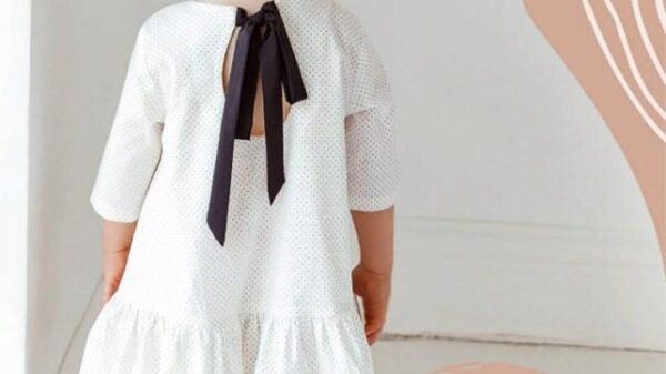 Платье для девочки свободного силуэта, отрезное ниже линии талии, длиной ниже колена. По низу платье имеет объемную широкую оборку. Декоративным элементом платья выступает вырез на спинке в виде капельки, который имеет завязки на бант. Горловина платья обработана обтачками. Рукав втачной длиной ¾.