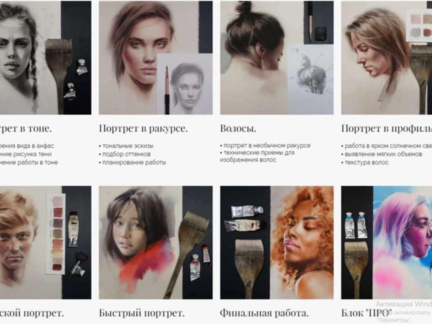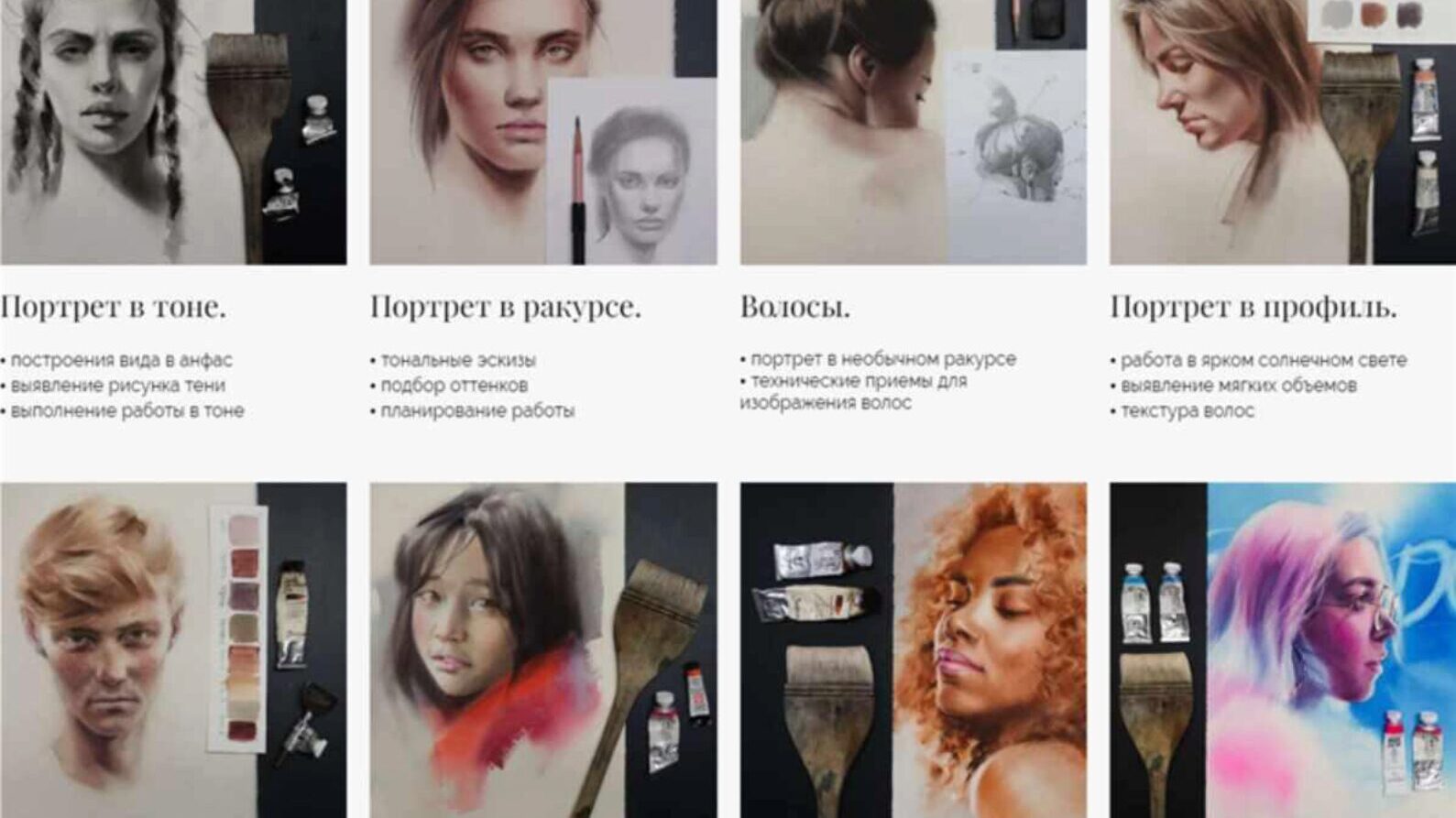 Портрет карандашом • способы наложения тона карандашом • полный разбор построения • демонстрация выполнения работы в тоне и технических приемов Портрет углем • особенности угольной техники • полный разбор построения • демонстрация выполнения работы в тоне и технических приемов Портрет акварелью •