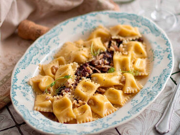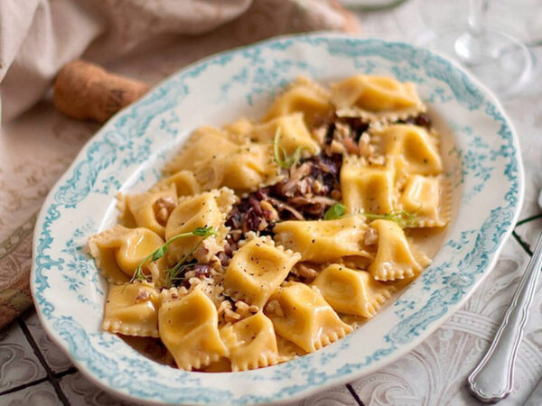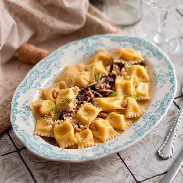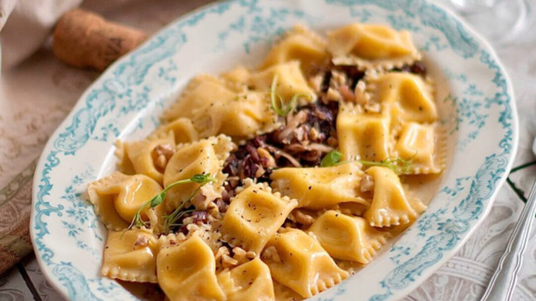 Аньолотти с начинкой из сыра Таледжио и медовым гарниром из пряного салата радичио
