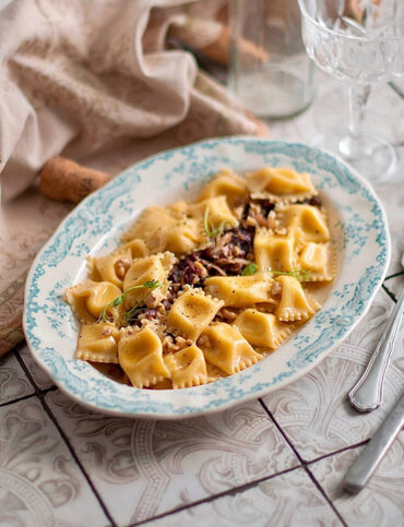 Равиоли с начинкой из сладкого батата и маскарпоне, в соусе из пикантного сыра Стилтон с сыровяленой уткой