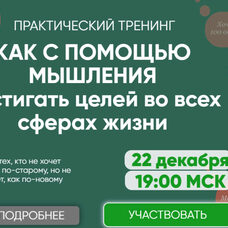 На практической встрече вы обнаружите и проработаете свои деструктивные денежные стратегии и вторичные выгоды, которые мешают вам повысить доход. Вы настроите новые механизмы взаимодействия с материальным миром, чтобы перейти на следующий уровень финансового благосостояния. Мероприятие будет
