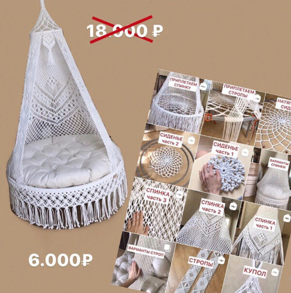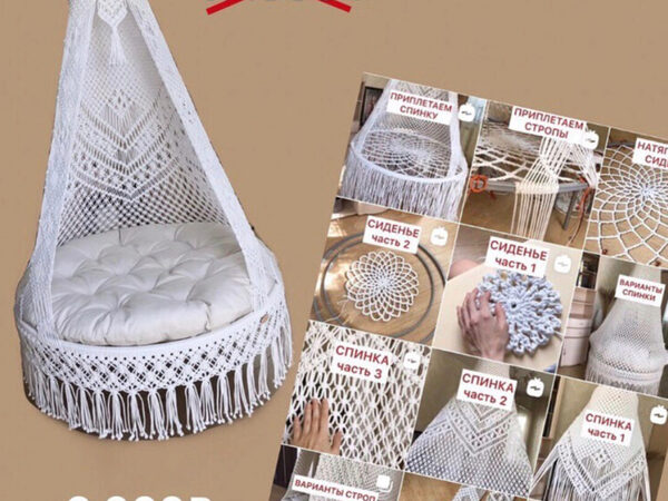 В наличии мастер класс по плетению подвесных кресел с подушками. В данном МК показаны 3 варианта плетения спинки и большое разнообразие лямок-ручек. Также в этом МК девочки делятся, где можно приобрести кольца для кресел, и много другой полезной информации. Мастер класс находится в закрытом