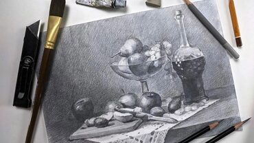 На примере яблока Роман покажет, как передать объем одного предмета. Здесь вас ждет работа с более сложной формой, кроме того, необходимо будет показать разницу фактур. Обсудим понятия штриха и пятна.