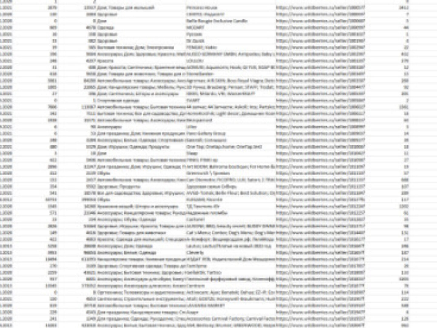 id продавца на Яндекс Маркете, Название магазина/продавца, Второе название магазина/продавца, Категории товара, Телефоны, Телефоны мобильные, Email, Сайт, ИНН, ОГРН/ОГРНИП, КПП, Название, Полное название, Тип организации, Дата создания, Юридический адрес, Регион регистрации, Должность руководителя, ФИО руководителя, Вид деятельности, ОКВЭД, Адрес, указанный на сайте Яндекс.