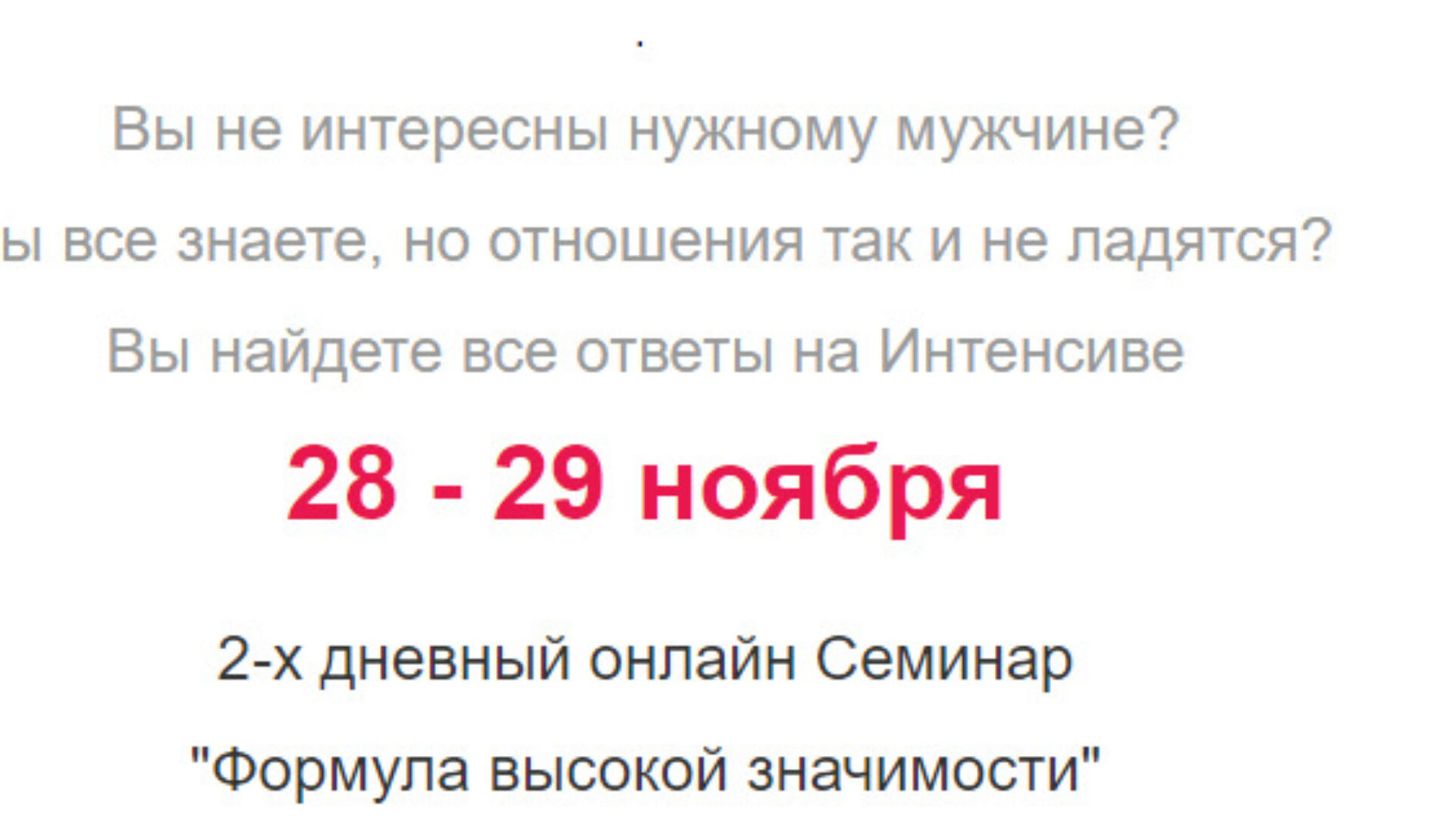ДЛЯ КОГО ЭТА ПРОГРАММА Хочет разжигать интерес и чувства мужчин при помощи переписки Хочет комфортно знакомиться с успешными мужчинами по всему миру Хочет даже на расстоянии поддерживать интерес мужчины Хочет отношения на расстоянии превратить в отношения в реале ЧТО БУДЕТ В ПРОГРАММЕ Что писать,