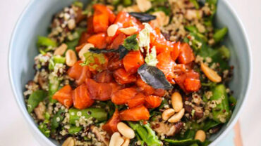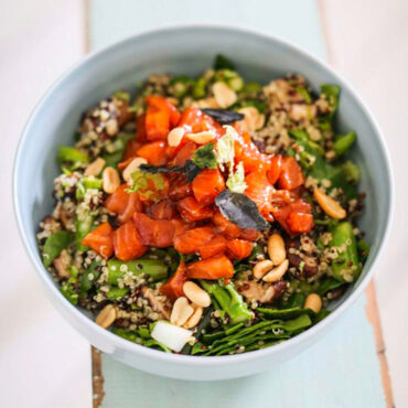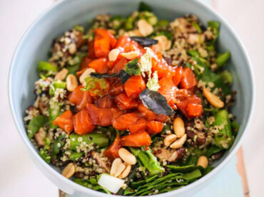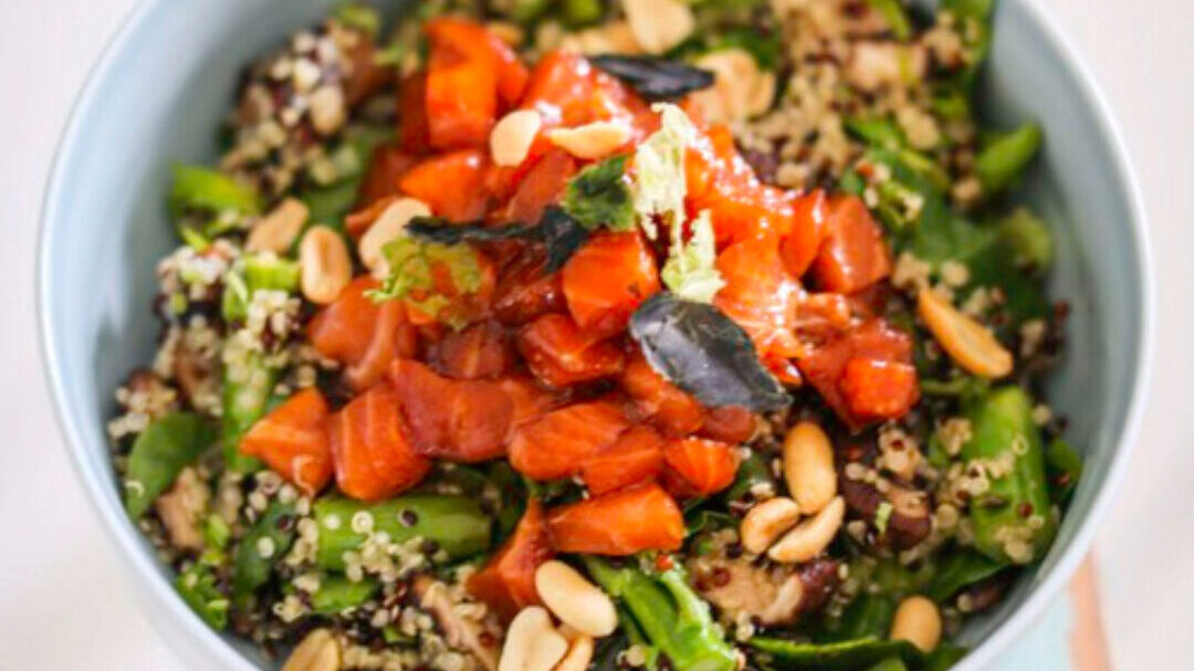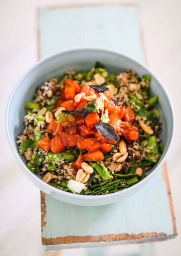 - Салат с креветками и манго, с заправкой из авокадо и спирулины
