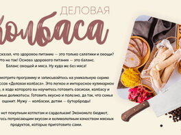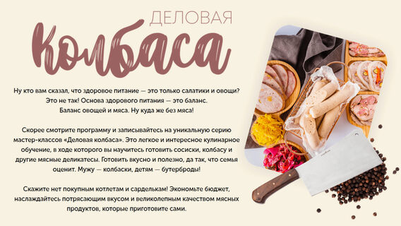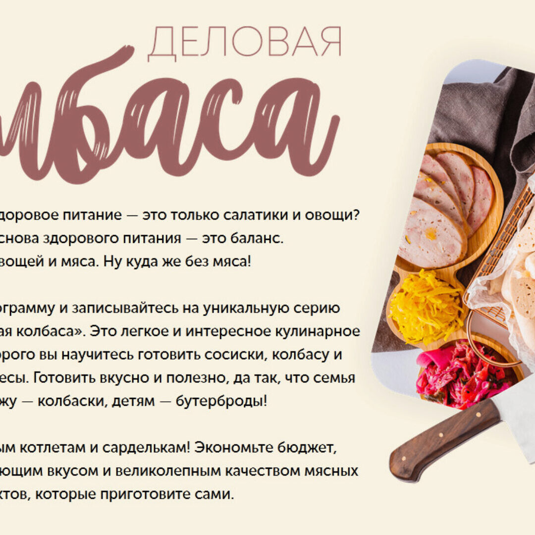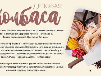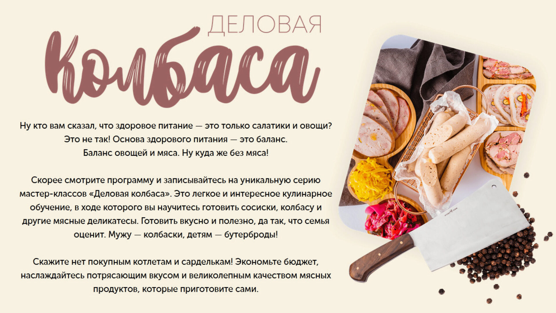 Сосиски, сардельки, ветчина, колбаса в неповторимом курсе с обновленной программой! «Деловая колбаса» – деликатесный курс о колбасе, сосисках, ветчине и сардельках для здорового и сбалансированного питания всей семьи. Чистый состав продукта и заметная экономия бюджета станут приятными бонусами к