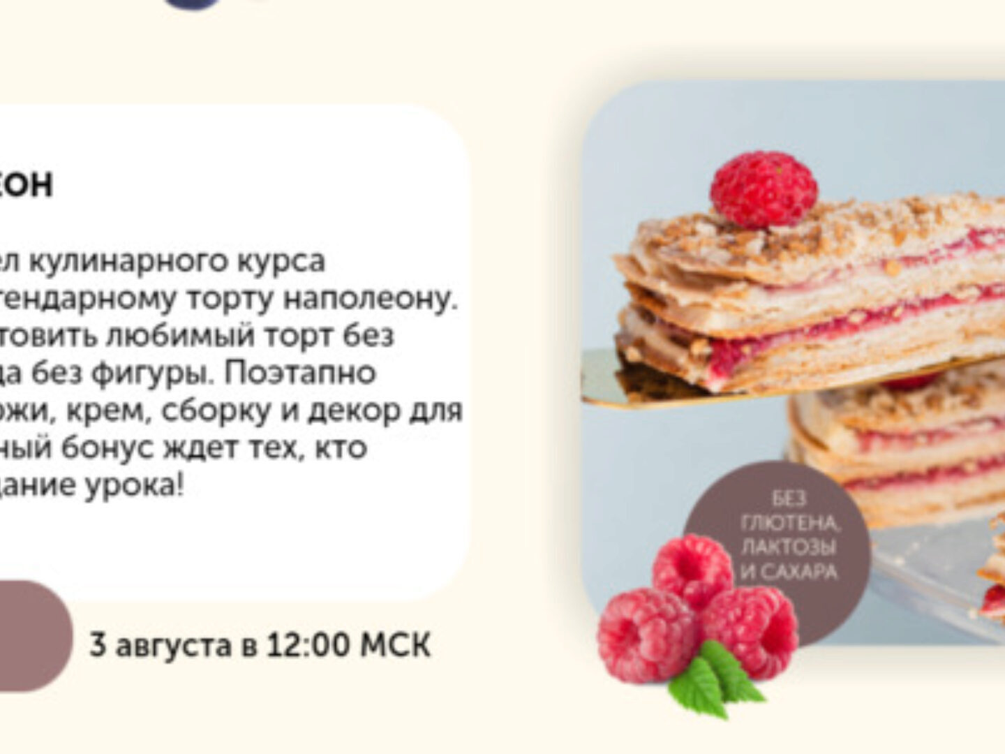 Второй раздел кулинарного курса посвящен легендарному торту наполеону. Научитесь готовить любимый торт без сахара и вреда без фигуры. Поэтапно разберем коржи, крем, сборку и декор для торта. Приятный бонус ждет тех, кто выполнит задание урока!