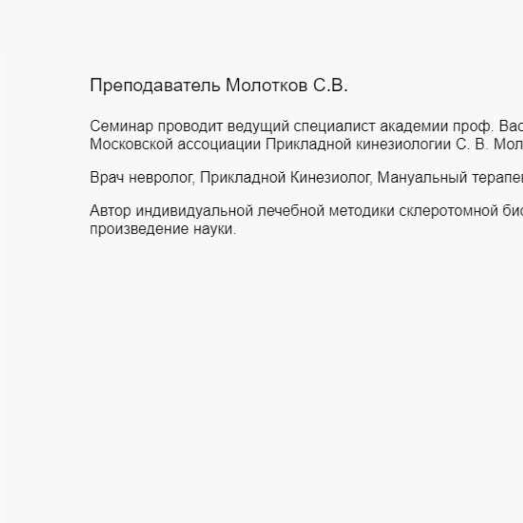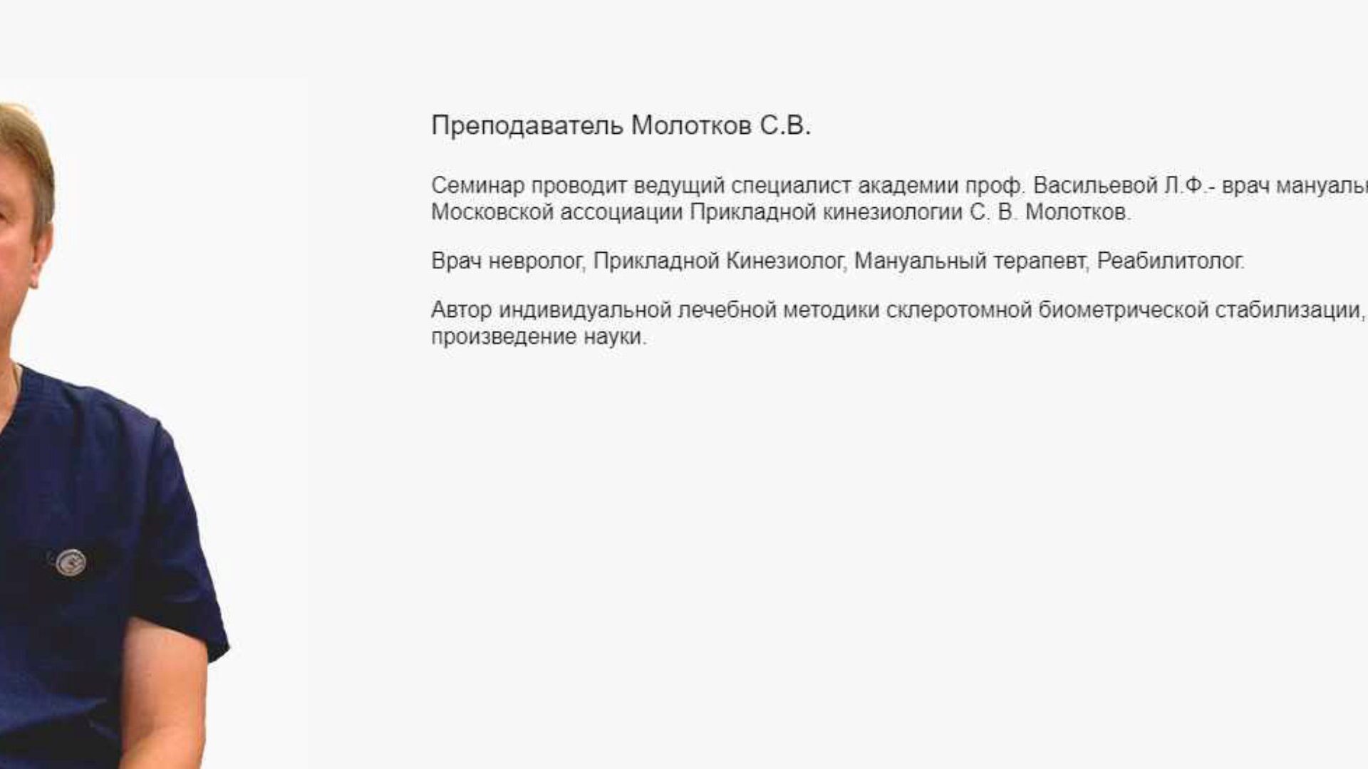 Преподаватель Молотков С.В. - Президент Московского филиала МАПК. - Главный врач научного центра прикладной кинезиологии и восстановительной медицины. - Ассистент кафедры прикладной кинезиологии Российской академии медико-социальной реабилитации. 1. В прикладной кинезиологии недостаточно
