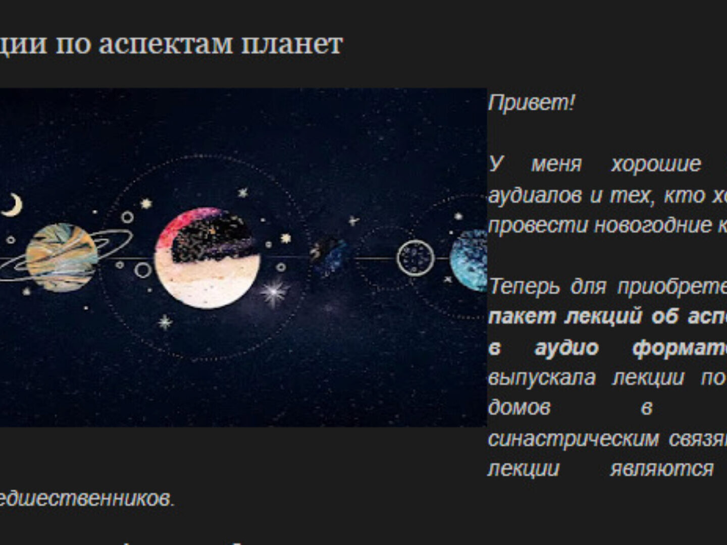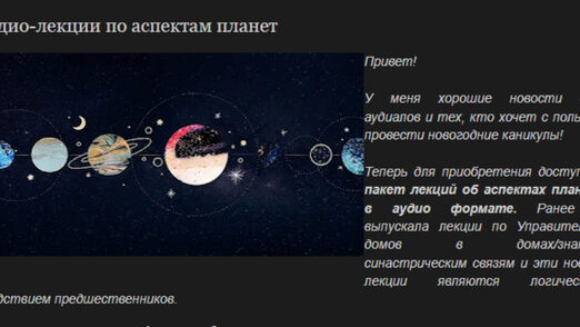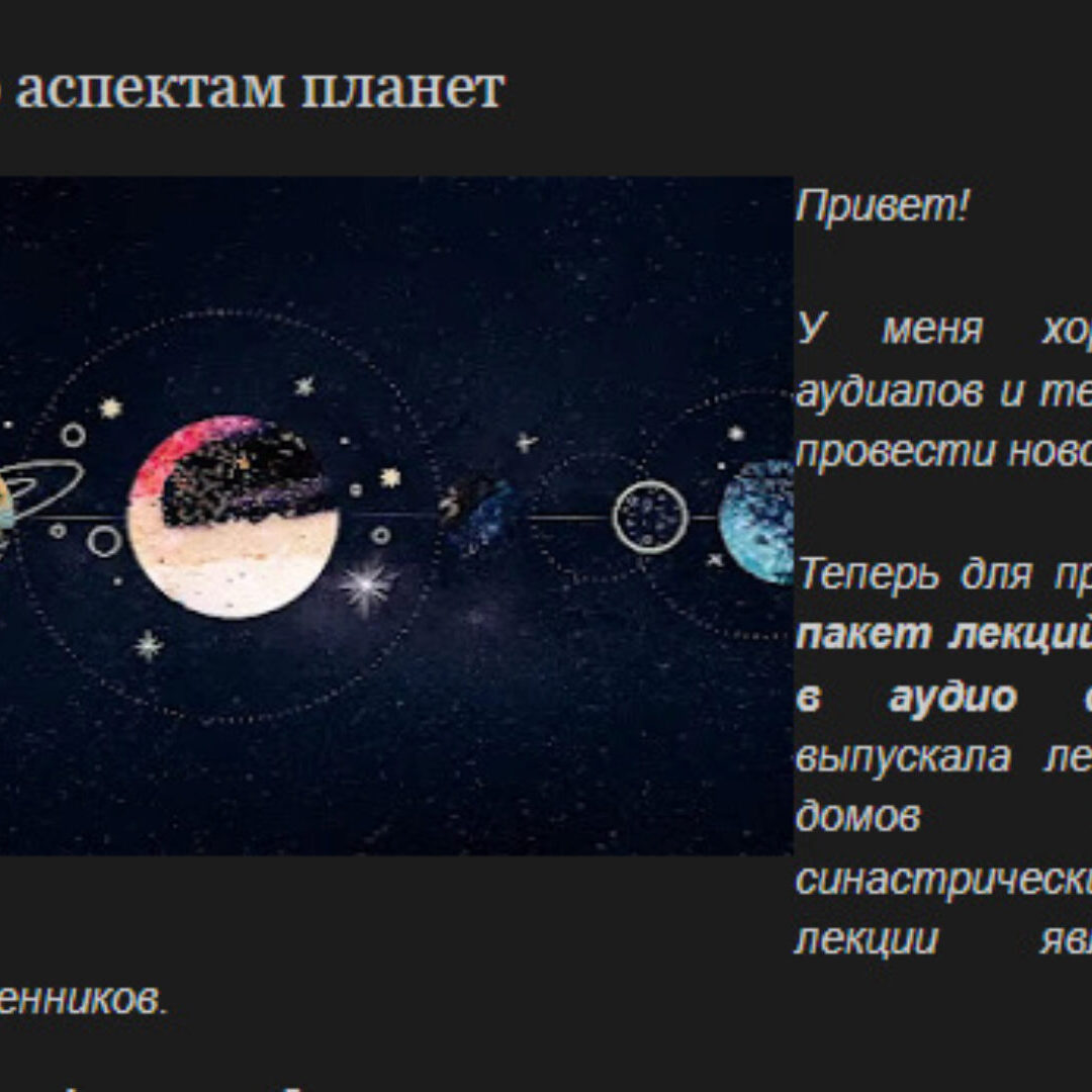 Пакет лекций об аспектах планет в аудио формате, где разбираются аспектные связи пяти планет: