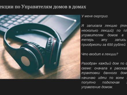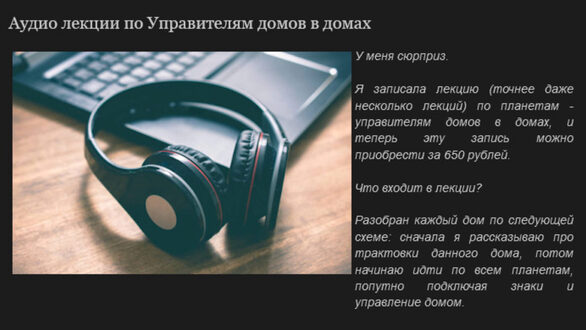 - пакет из 12 лекций по количеству домов, где разобран каждый дом по следующей схеме: сначала автор рассказывает про трактовки данного дома, потом начинает идти по всем планетам, попутно подключая знаки и управление домом;