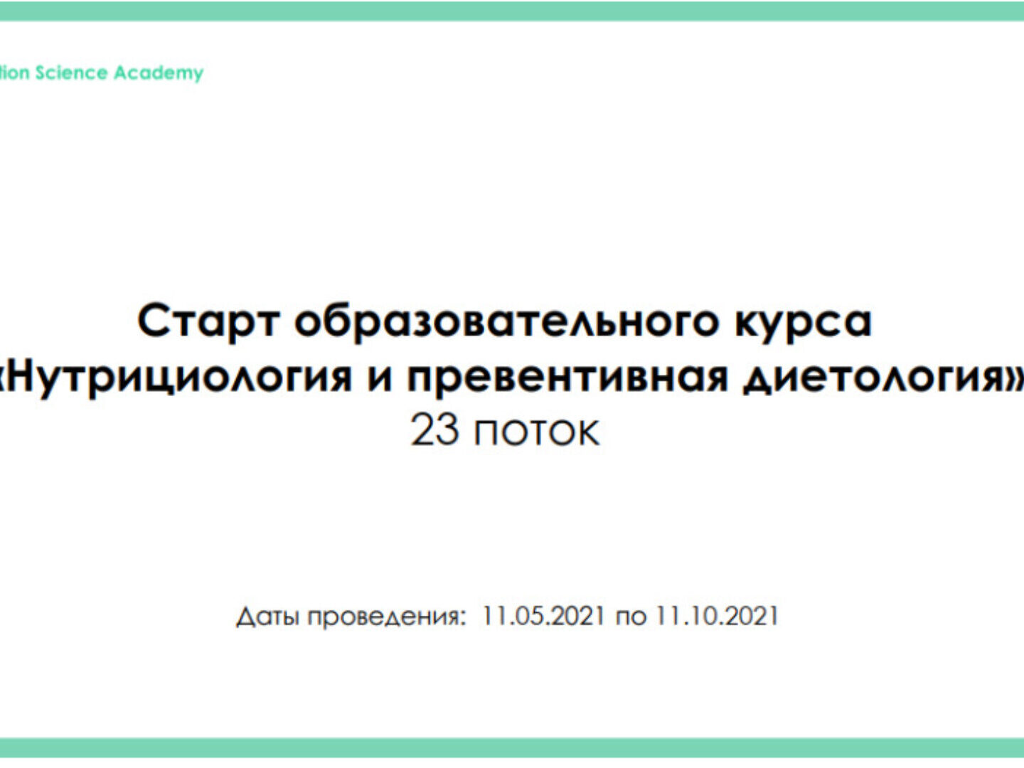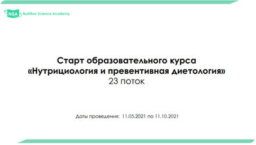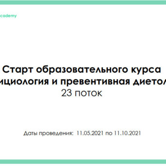 Образовательный курс по нутрициологии и диетологии «22 ПОТОК» Объемно. Фундаментально. Научно. Местами сложно, но захватывающе. Обучение, меняющее взгляд на привычные вещи. Длительность курса: 5 месяцев Академия Нутрициологии лицензирована Министерством образования РФ О курсе: Данная