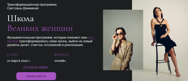 Школа Великих женщин покажет вам четкий путь в тот мир, где вы можете быть другой — счастливой, легкой, гармоничной и наполненной энергией.