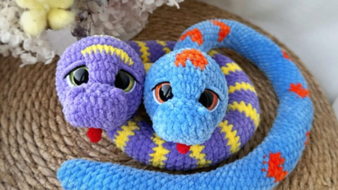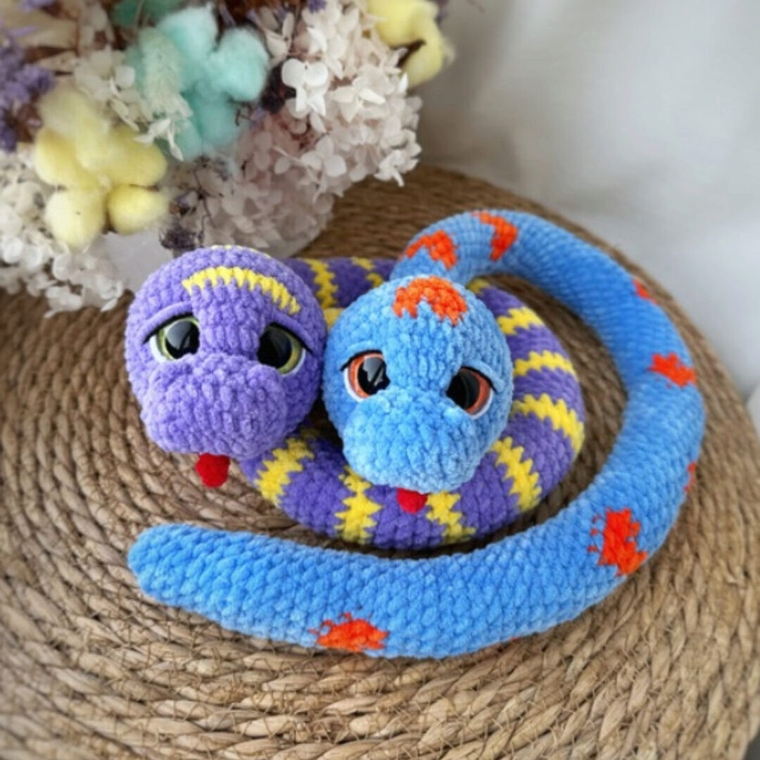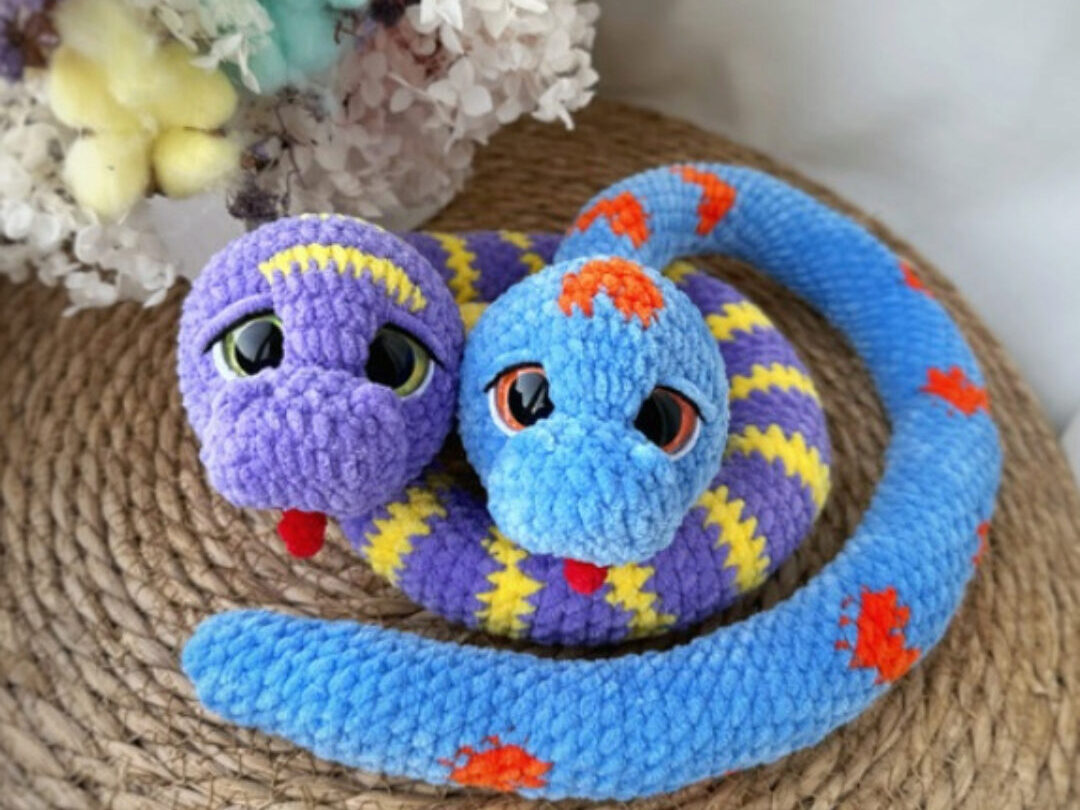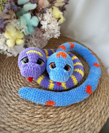 В описании входит пошаговое инструкция вязание змеек в двух вариантах: крючок и крючок/спицы. Уровень сложности – лёгкий. Все спицевые детали вяжутся на двух спицах.
