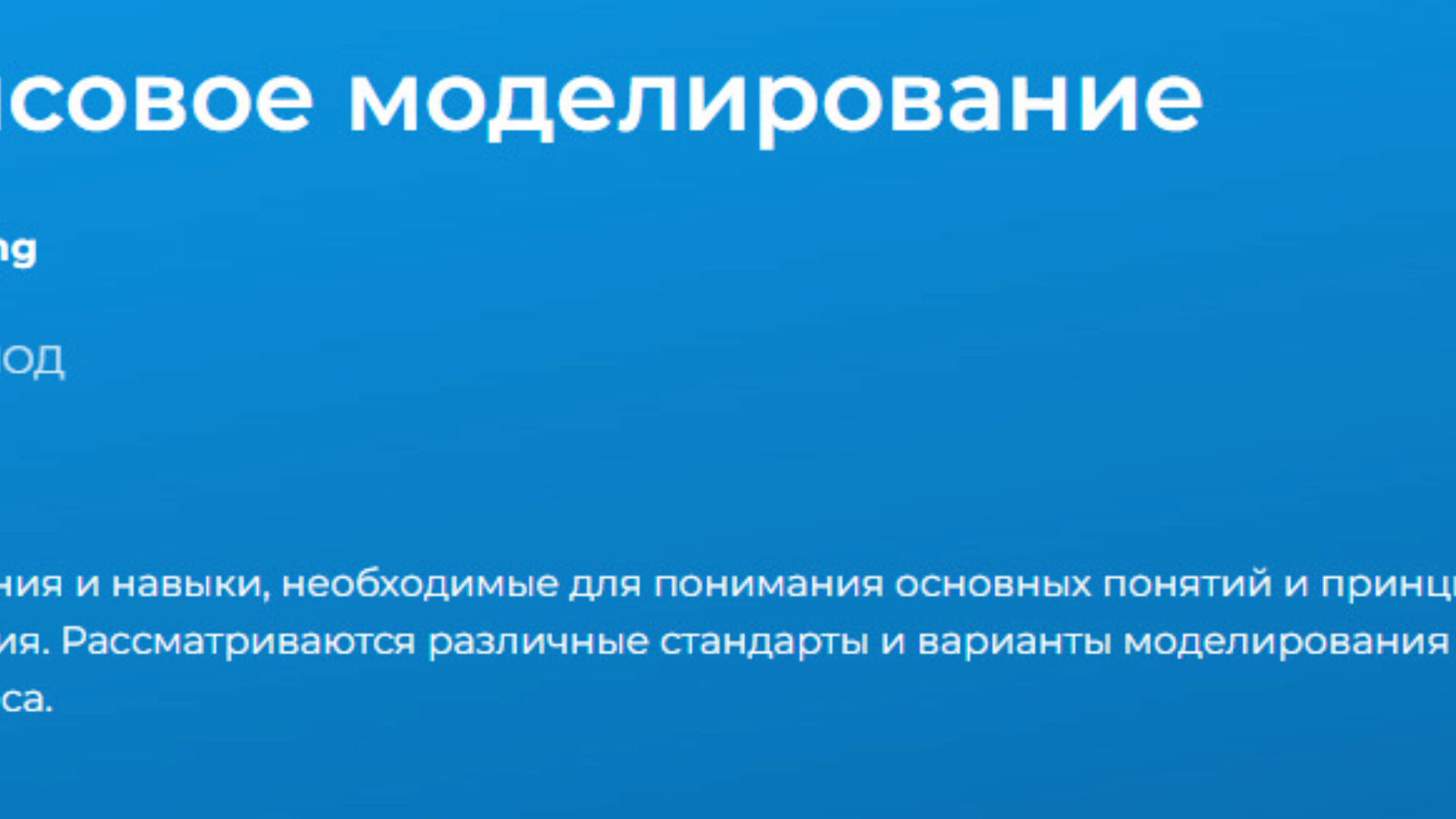 Курс дает знания и навыки, необходимые для понимания основных понятий и принципов моделирования. Рассматриваются различные стандарты и варианты моделирования в привязке к модели бизнеса.