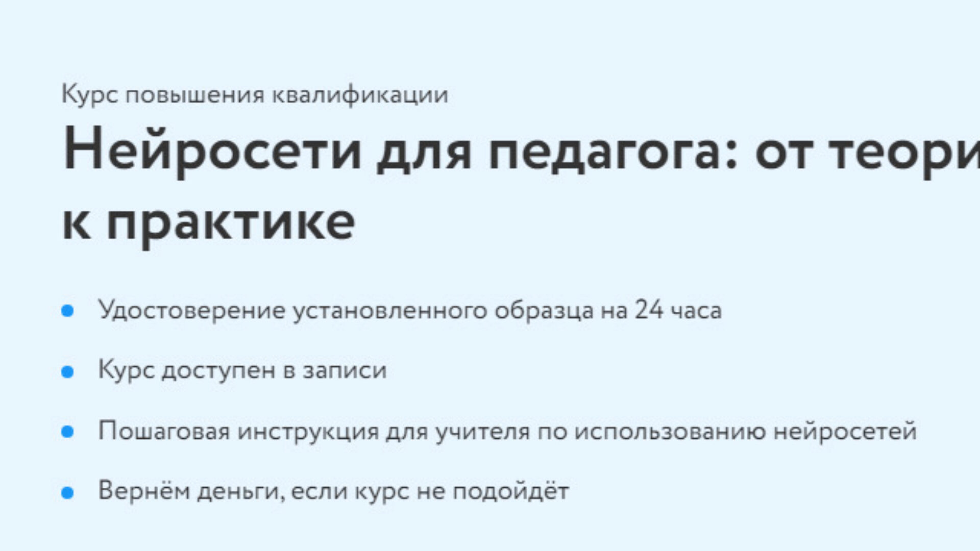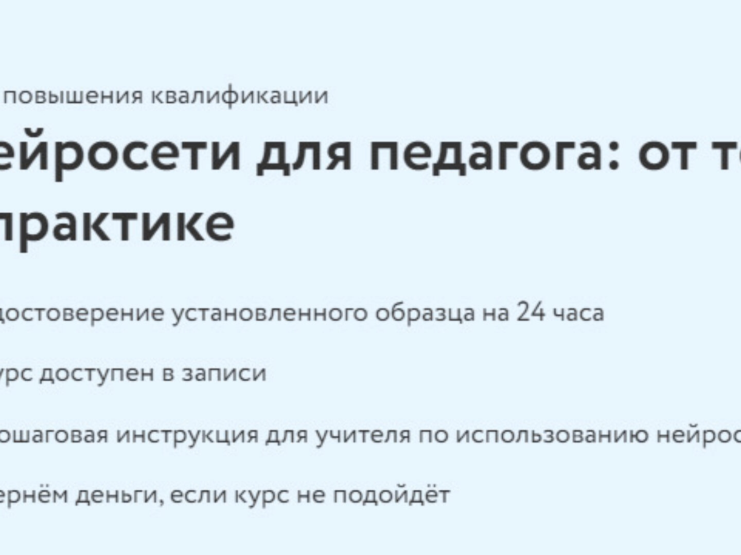 - Понимание возможностей нейросетей. Разберетесь, что можно делать с их помощью и как облегчить себе работу по подготовке к занятию