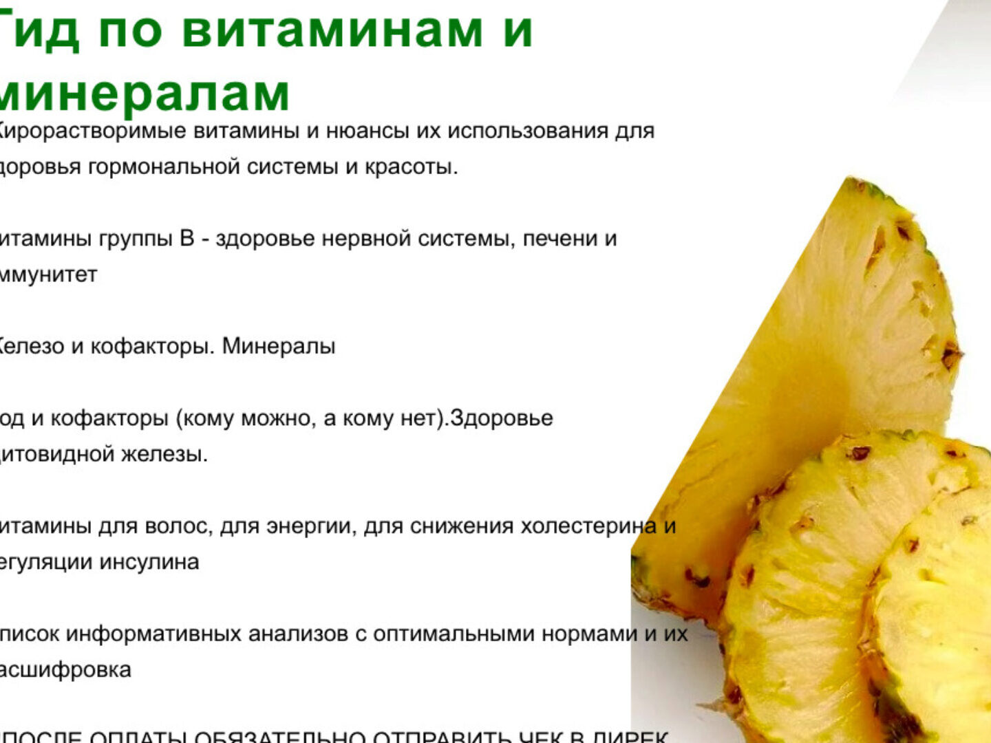 Полный пакет включает: 1. Памятка по самым популярным нутрицевтикам 2. Памятка по приему витаминов и минералов 3. СПРАВОЧНИК по минералам и витаминам (жирорастворимым) 4. Руководство по АНТИОКСИДАНТАМ 5. Руководство «Симптом - решение» 6. Руководство по расшифровке анализа ХМС по Осипову 7. Полное