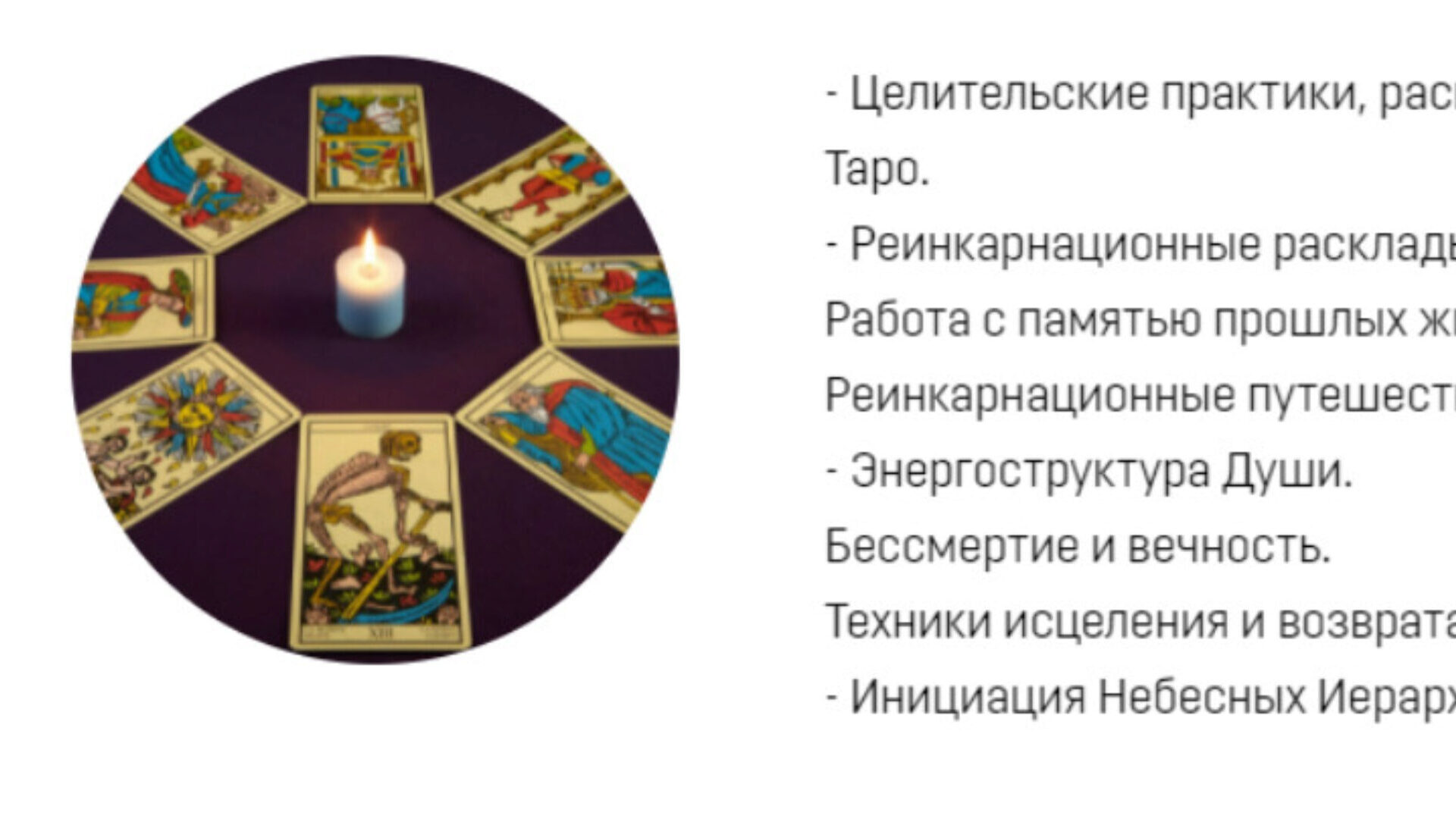 - Целительские практики, расклады и коррекции Таро.