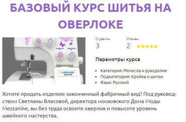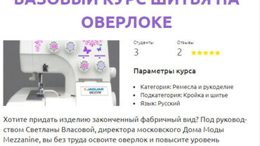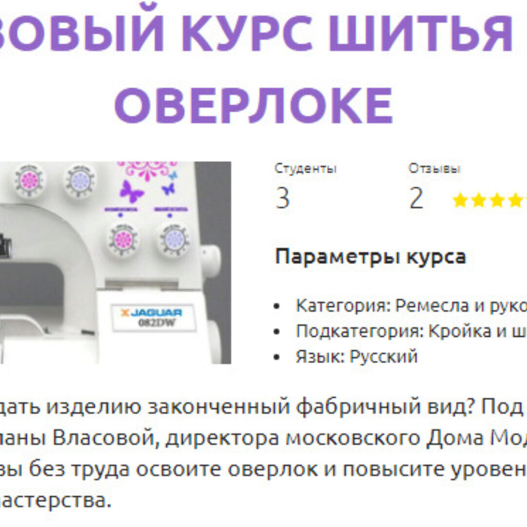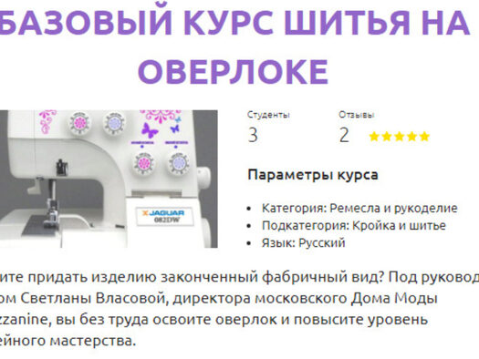 Безупречный вид — достоинство любой единицы гардероба или интерьера. Для швеи любого уровня важна аккуратность работы. Придать изделию законченный фабричный вид поможет оверлок - краеобметочная машина. Она позволяет обрабатывать края ткани так, чтобы волокна не осыпались. Конечно, оверлок — это довольно сложный механизм, но если четко следовать инструкциям и знать некоторые хитрости, то работа пойдет легко и быстро. Благодаря курсу Светланы Власовой, дизайнера одежды, автора методик кройки, шитья и вязания, директора Дома Моды Mezzanine, вы сможете научиться шить на оверлоке и повысить свое мастерство. Курс адресован широкой аудитории – тем, кто только обучается профессии швеи, и тем, кто хочет самостоятельно научиться шить.