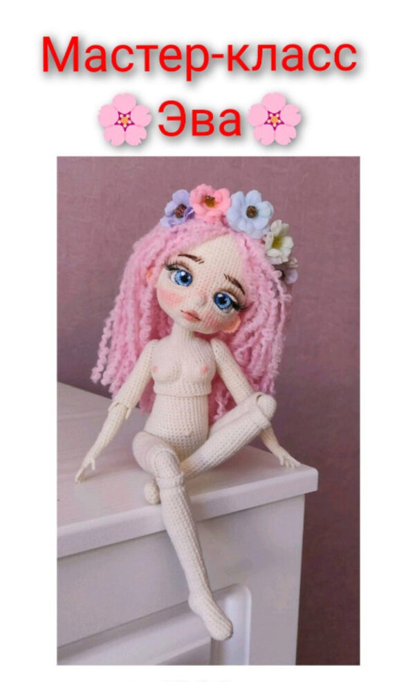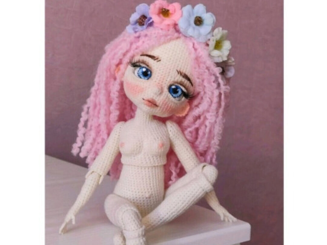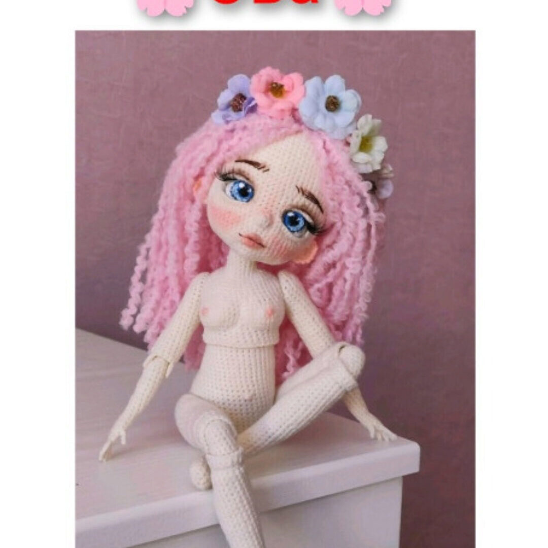 Мастер класс оформлен в PDF Вы получите описание на 21 страницах, включает в себя 28 фото. Высота 14 см. Плечевые и бедерные соединения на пластиковых суставах. Коленные и локтевые соединения шарнирно-нитевые. Голова поворотная. Подробное описание вязания самой малышки, а также сборка куколки.