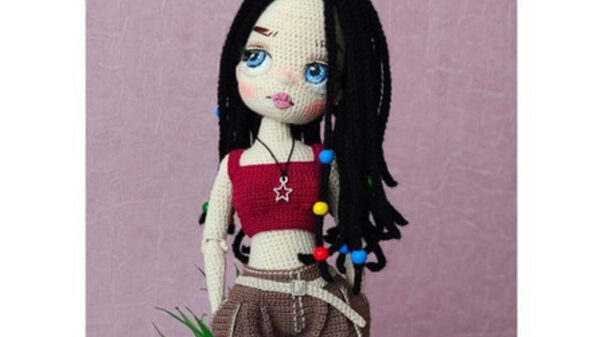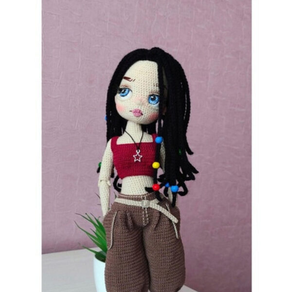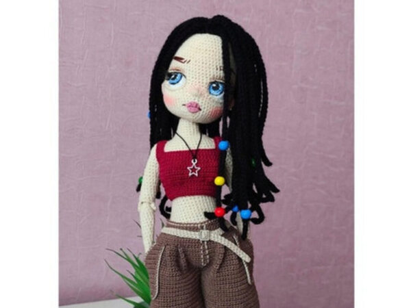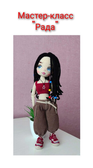 Мастер класс оформлен в PDF Вы получите описание на 21 страницах, включает в себя 28 фото. Высота 14 см. Плечевые и бедерные соединения на пластиковых суставах. Коленные и локтевые соединения шарнирно-нитевые. Голова поворотная. Подробное описание вязания самой малышки, а также сборка куколки.