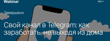 Этот вебинар поможет каждому из Вас заработать на своём канале в Telegram. Вы узнаете: - Как, сидя дома, получать доход в миллион и больше от своего канала в Telegram - Как раскрутить канал, если нет денег на продвижение - Как продать в Telegram свои товары или услуги - то, чем занимаетесь именно Вы - Как раскручивали известные каналы в Telegram (на примере каналов «НЕЗЫГАРЬ», «СОЛОВЬЕВ», «Караульный», «Футляр от виолончели», «Майор и Генерал» и др.) Это единственный в Сети вебинар, который научит Вас раскручивать свои каналы и зарабатывать на этом! Регистрируйтесь прямо сейчас!