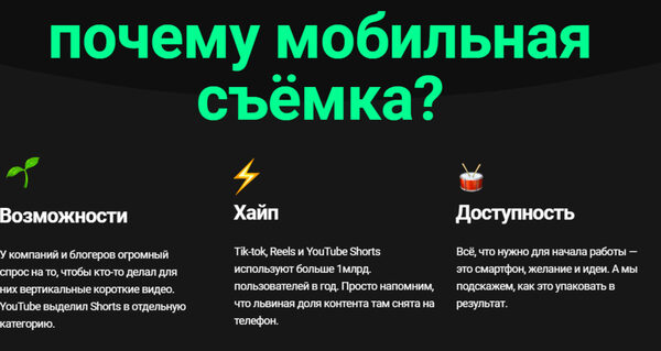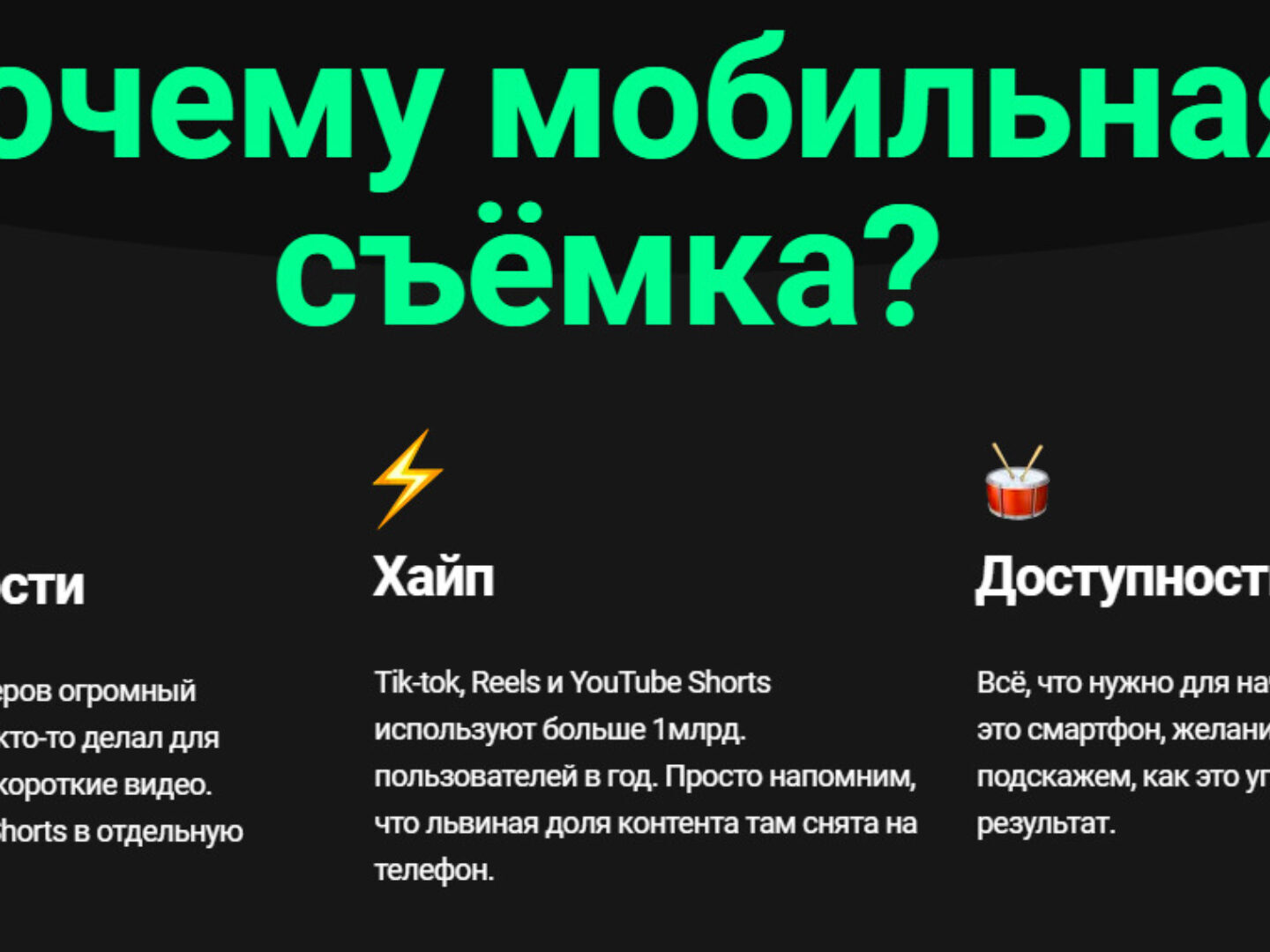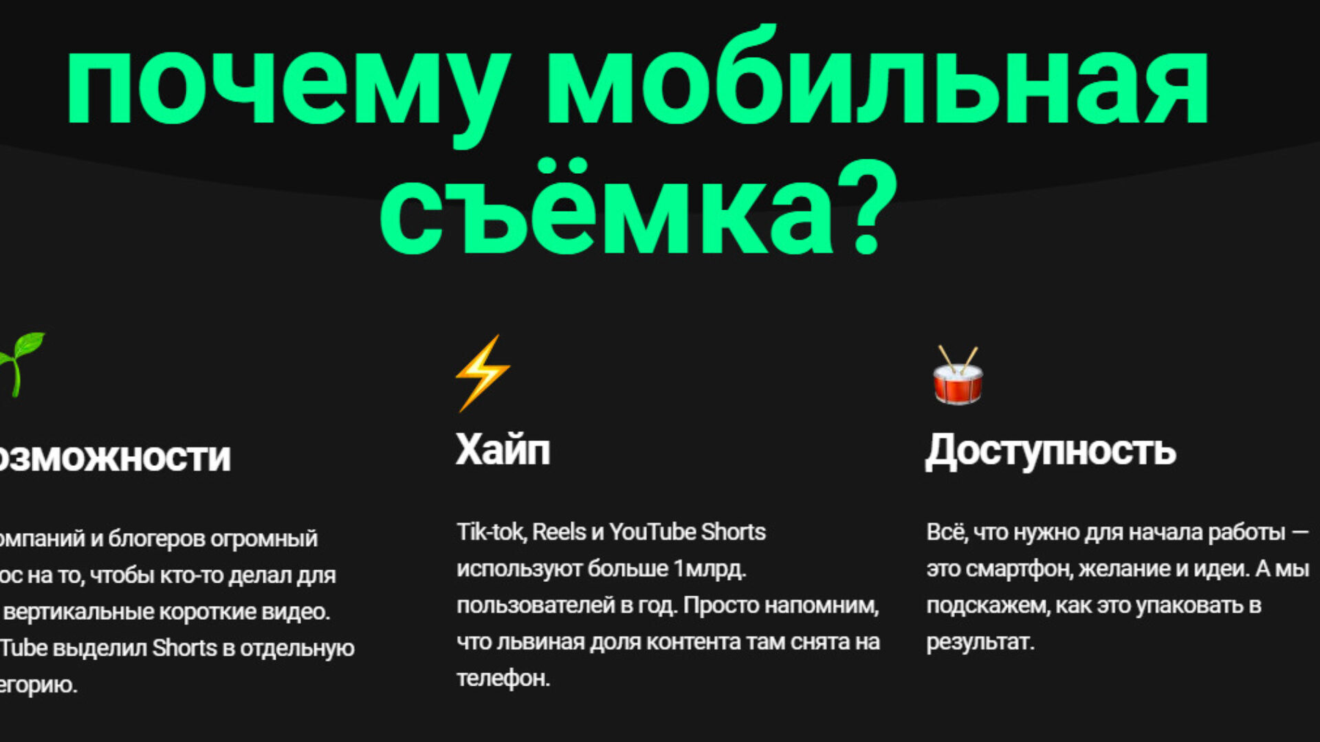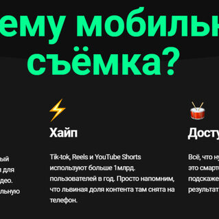 Это курс с нуля для тех, кто понимает, что съёмка на мобильный телефон — это тренд, а вертикальные видео набирают просмотров сейчас больше, чем любой другой формат.