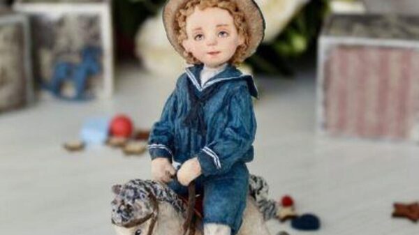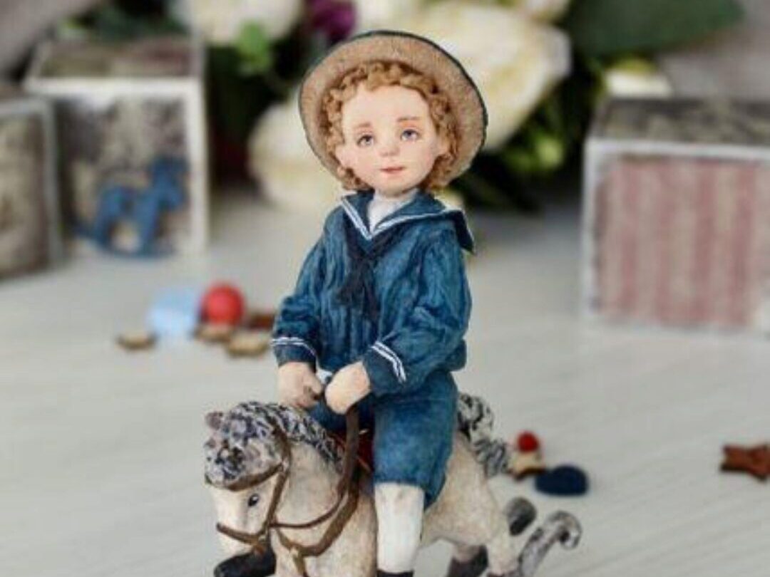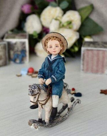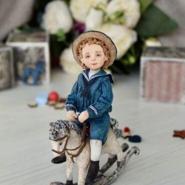 Малыш, которого мы будем делать на мастер классе, будто-бы позирует для фото. Он одет в костюм, очень модный в 19 веке, сидит на лошадке-качалке, любимой игрушке мальчишек того времени. Такая игрушка станет прекрасным украшением любой елочки.