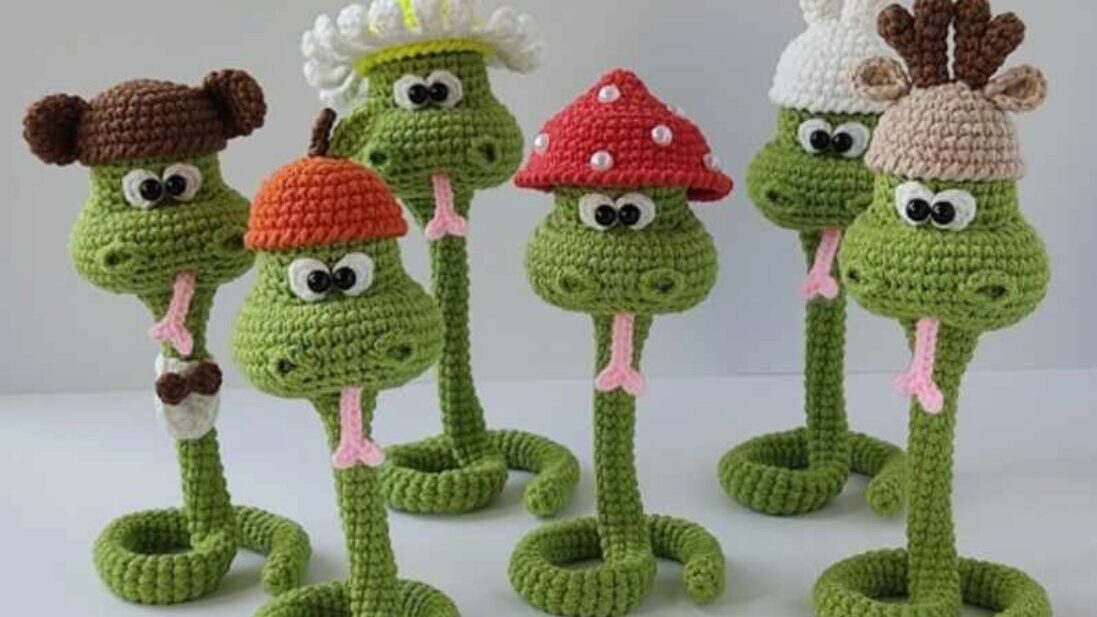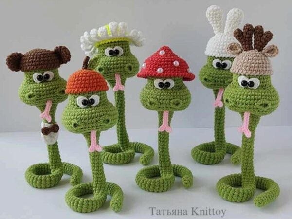 Мастер-класс Змейки в шапочках содержит схему вязания игрушки щмейки и комплекта из 6 шапочек (зайка, мишка, ромашка, гриб, олень и мандарин). МК содержит подробное пошаговое описание, а также фото и схемы всех этапов работы. Не содержит уроки вязания крючком.