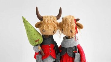 В этой школе мы создадим Быка, символ 2021 года, и его подружку. Ребята у нас будут не простые, а шотландские! Эти челки Обожаю Так же, мы сошьем 2 комплекта одежды, для него и для нее, елку и сделаем подарок в руку девочке.