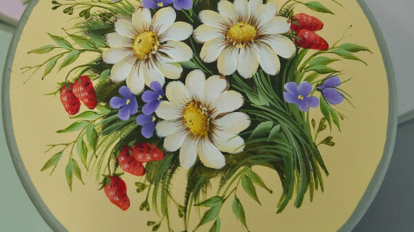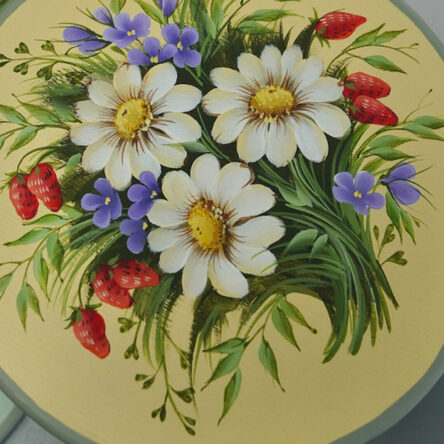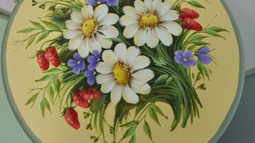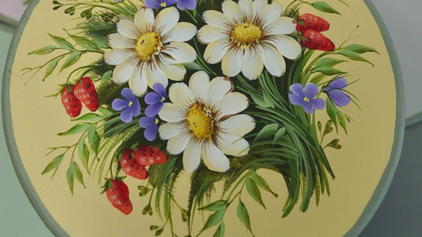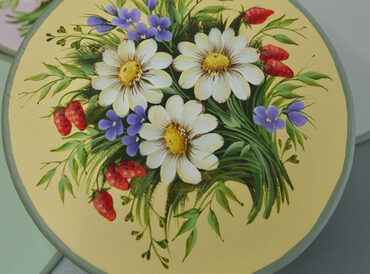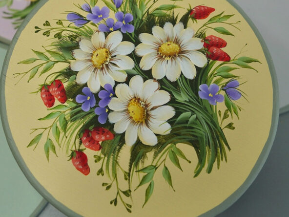 Четыре урока – композиции на подставках под горячее. Композиция целиком состоит из цветов, листьев, ягод. Рисуем на деревянных кругах диаметром 15 см. Пятый урок – расписываем подставочку под круги.