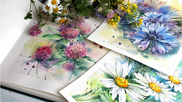Уроки максимально подробные, начиная от построения карандашом и рецептов смешивания красок для получения прозрачных акварельных переливов и сочных акцентов. Вы нарисуете три акварельных картины, наполненные ощущением тепла летнего луга.