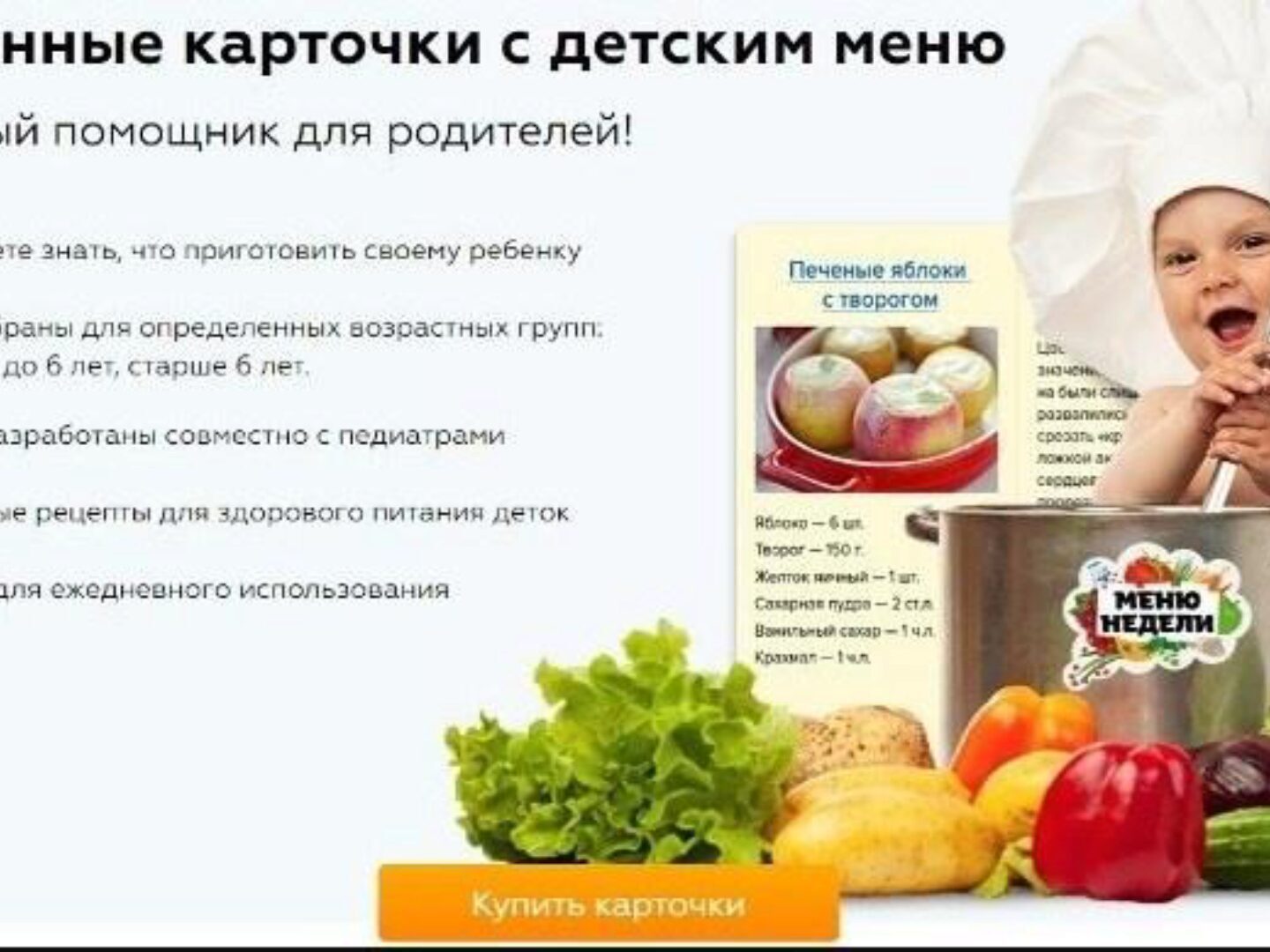 Хотите быть уверенной, что меню вашего ребенка состоит только из здоровых блюд, подходящих его возрасту? Хотите составлять меню, но не хотите чертить и заполнять таблицы, писать списки и мучительно вспоминать, что вписать в очередную строчку напротив дня недели? Вам нравится идея ходить в магазин