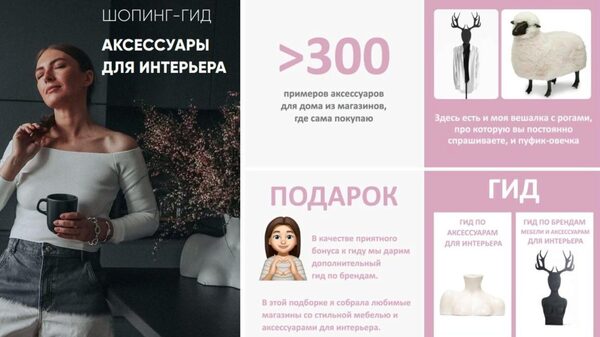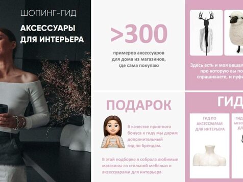 В этом шопинг-гиде я собрала: >300 примеров аксессуаров для дома из магазинов, где я сама покупаю Здесь есть и моя вешалка с рогами, про которую вы постоянно спрашиваете, и пуфик-овечка ПОДАРОК В качестве приятного бонуса к гиду мы дарим дополнительный гид по брендам. В этой подборке я собрала