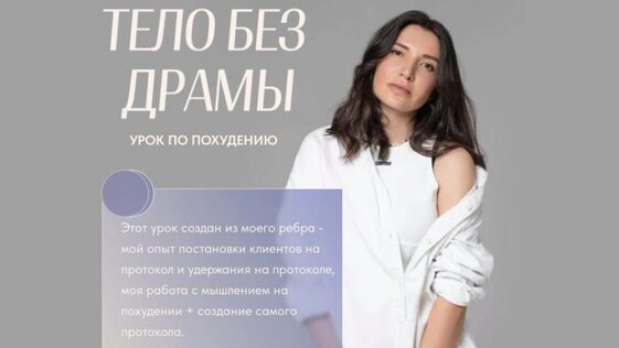 - Тело без драмы - это полный слив метода моего коучинга ценностью 100 000 р. Прогресс во всех категориях жизни клиента. Урок нужен вам, если вы много раз пробовали сами, у вас не получилось и вам нужна помощь профессионала.