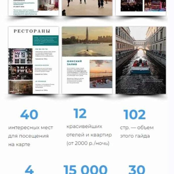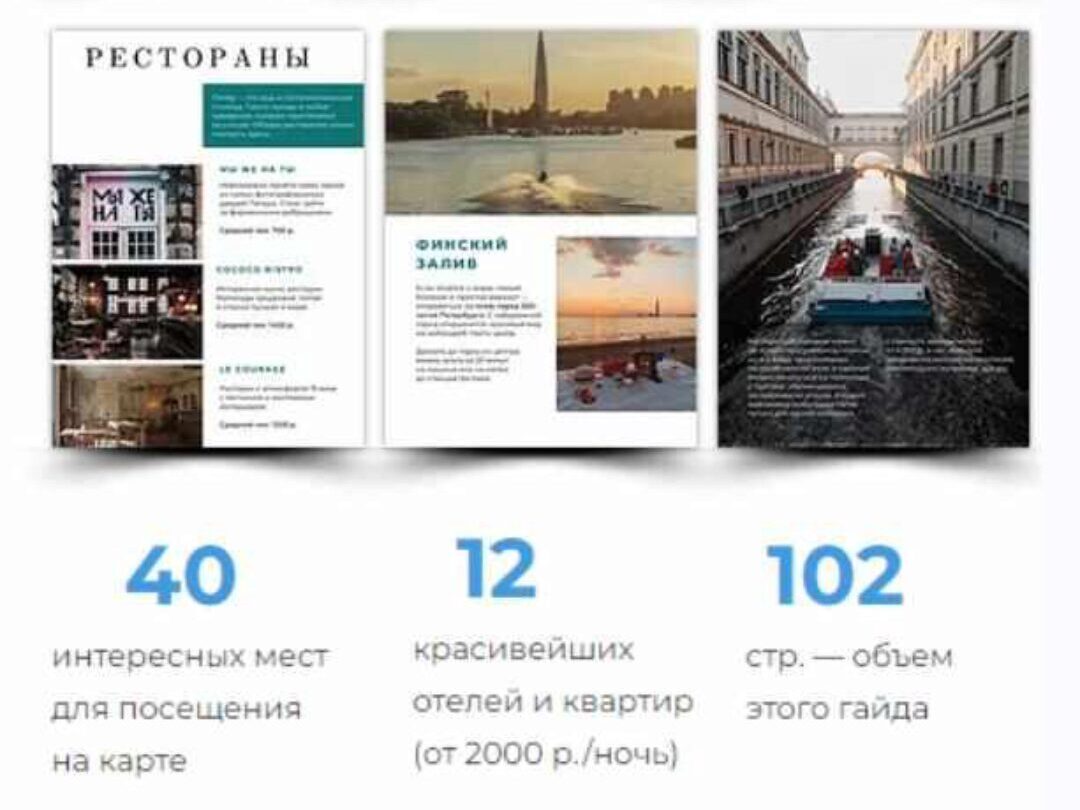 Электронный гайд 70 стр Купить гайд Что внутри гайда? 5 дней средняя длина поездки 50 точек мы отметили на карте 70 страниц в гайде Завтракать и обедать в настоящих дворцах и отелях мирового уровня, дышать морским воздухом в круизе, разъезжать по балам или по барам и наслаждаться лучшими питерскими