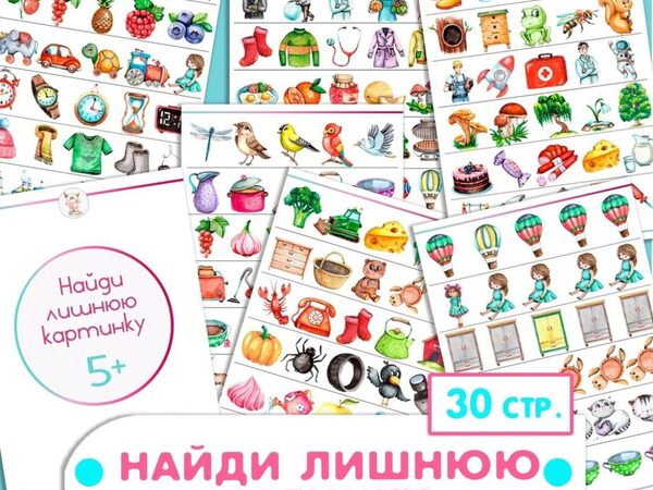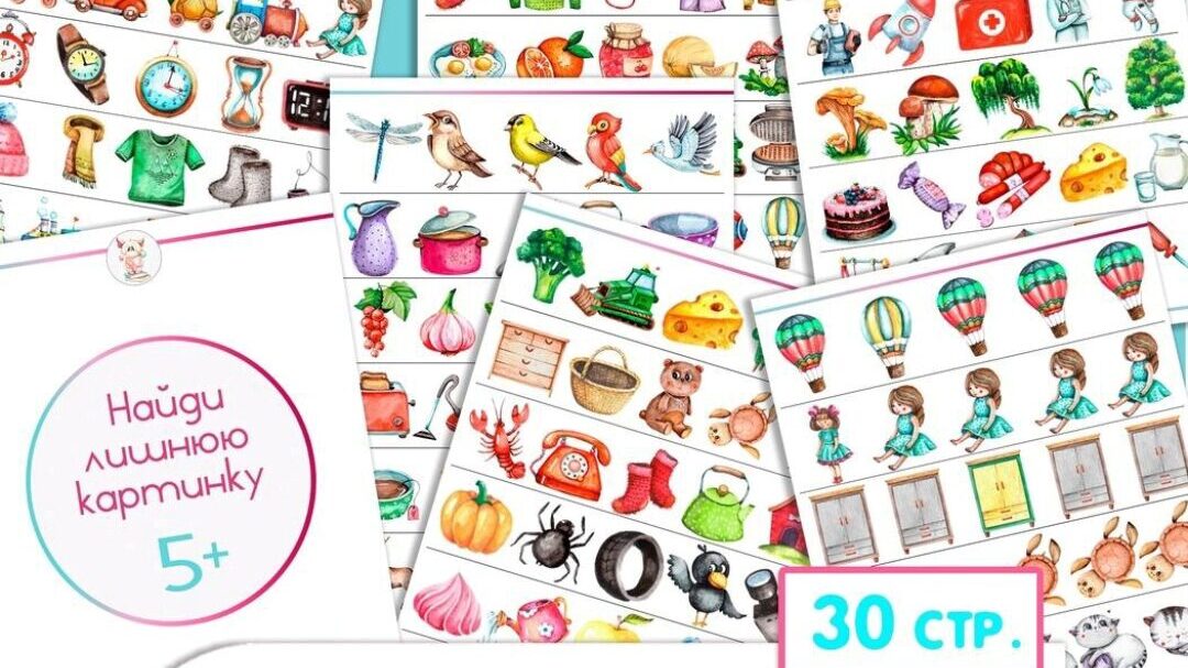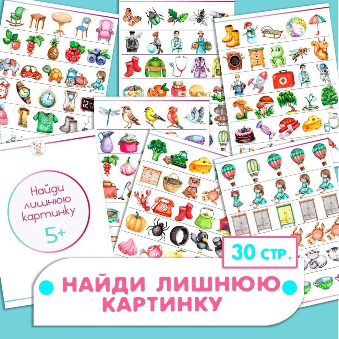 Всего в сборнике 30 СТРАНИЦ: где 168 заданий НА ЛИШНЮЮ КАРТИНКУ - ПО 6 заданий на одном листе