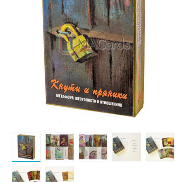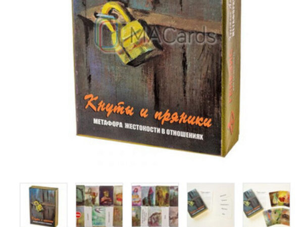 «Кнуты и пряники» – это колода про воспитание, ограничения, наказания, подавление, про чувства, ресурсы и опоры, про детско-родительские отношения и отношения с окружающими.Колода создавалась как инструмент работы, в первую очередь, именно с детьми – жертвами разных форм жестокого обращения в семье. Речь идет обо всех формах жестокого обращения, включая физическое, психологическое, сексуальное насилие и пренебрежение нуждами ребенка. Колода дает возможность ребенку отреагировать, вывести вовне сложные эмоциональные переживания, найти точки опоры для дальнейшей жизни и ресурсы для преодоления травматических событий. Жестокое обращение с детьми – дело не только семейное. Дети становятся жертвами и в школе, и во дворе, и в других (порой абсолютно непредсказуемых) условиях. С помощью колоды «Кнуты и пряники» можно работать с эмоциональной нестабильностью жертвы, удовлетворять потребность в поддержке, создавать ощущение защищенности. Жизненный опыт ребенка может делать и его самого инициатором жестокости по отношению к другим детям, к обществу в целом. В данном случае колода дает возможность исследовать вместе с ребенком природу такого его поведения, эмоции и чувства окружающих людей. Таким образом, набор карт ориентирован на следующие направления работы с детьми: – коррекционная работа в случае семейного, школьного и других видов насилия; – коррекционная работа в случае агрессивных отношений в детском коллективе (как с жертвами насилия, так и с агрессорами, инициаторами травли).
