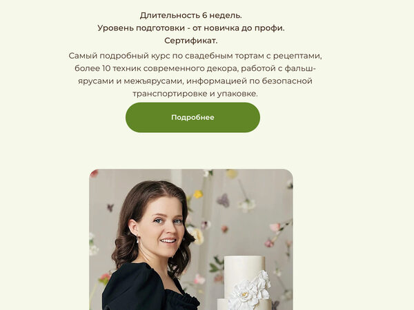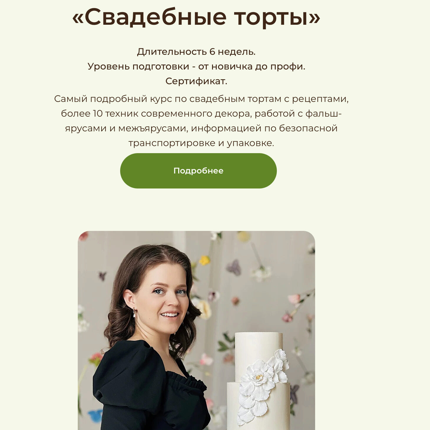 Самый подробный курс по свадебным тортам с рецептами, более 10 техник современного декора, работой с фальш-ярусами и межъярусами, информацией по безопасной транспортировке и упаковке. ✓ Необходимое оборудование ✓ Конструкции для ярусных тортов, способ их крепления и сборки ✓ 5 топовых начинок
