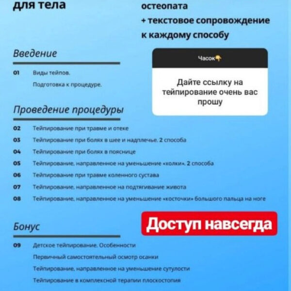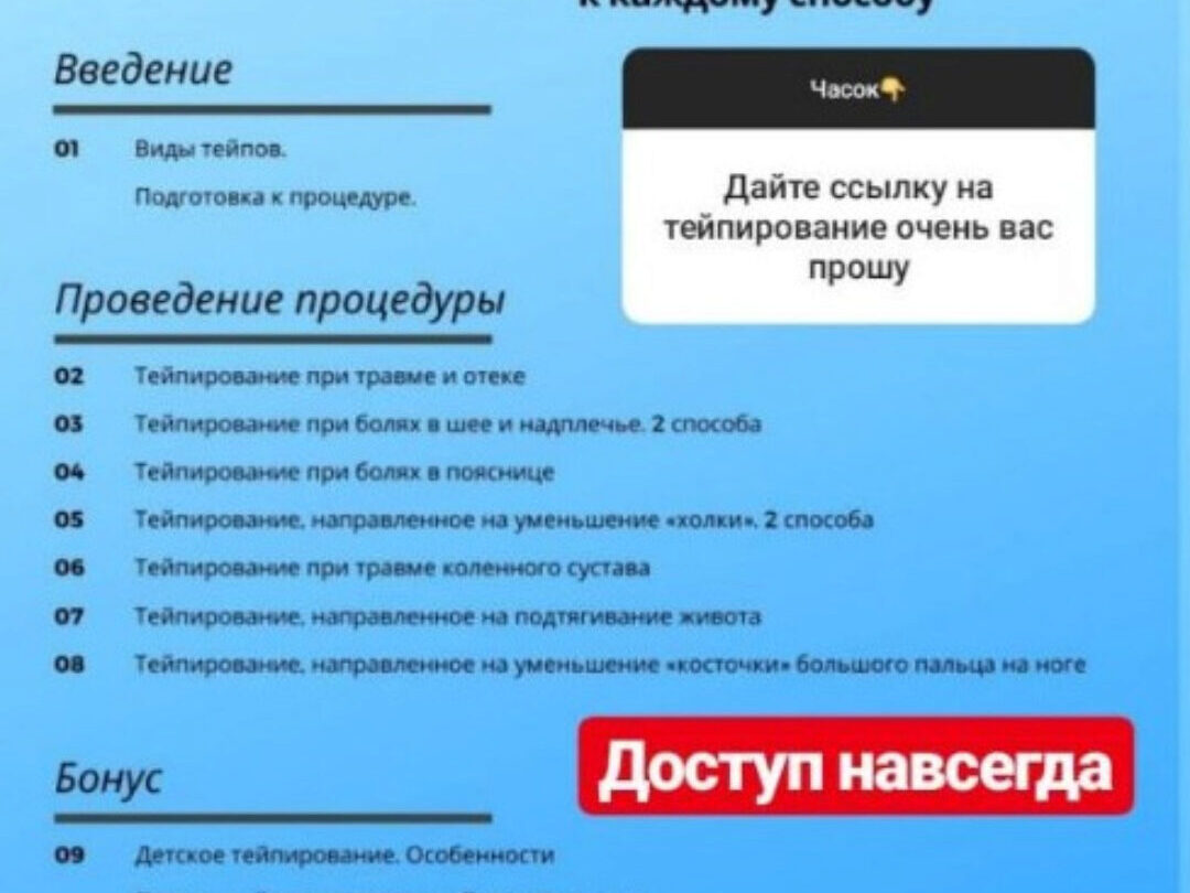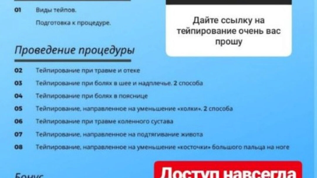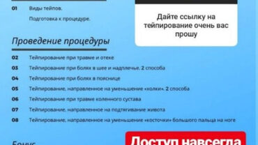 Техники, практические видео уроки, концентрат проверенной информации и методов. Без воды. Без лишних ненужных манипуляций. Только о важном вашем лице эффективном омоложении и проработке конкретных индивидуальных проблем Скажу одно: в умелых руках мастерство тейпирования заменит вам ряд сложных