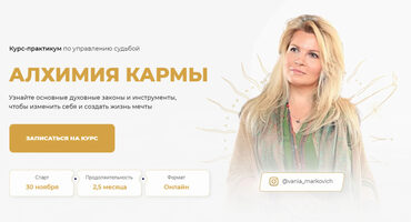 Курс «Алхимия кармы» для тех, кто ищет глубоких изменений в разных сферах своей жизни, но не знает, как их осуществить. На нашем курсе, который основан на древних знаниях духовной психологии, вы узнаете, как пользоваться главными законами Духовности, чтобы трансформировать все сферы своей жизни: доход, самореализацию, отношения, здоровье, уверенность в себе. Здесь вы узнаете, как устроен наш мир на самом деле, поймёте, как применять законы Духовности в жизни, и получите чёткие инструменты для глубокой работы над собой