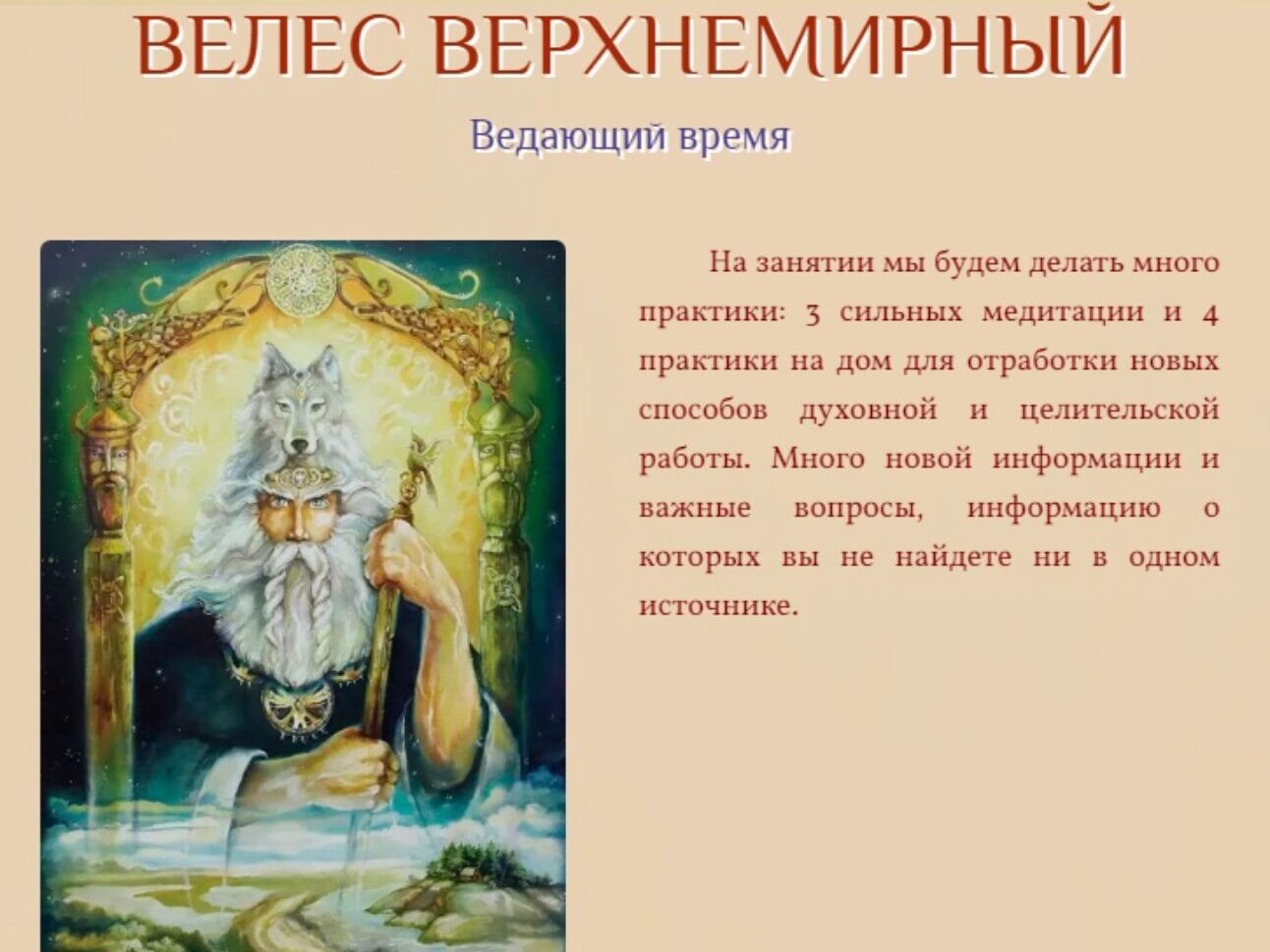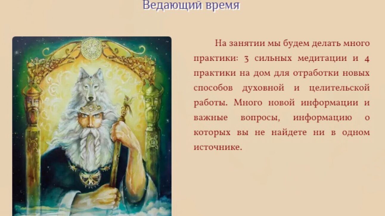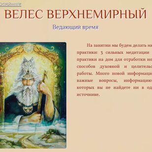 3. Мы прикоснемся к магии времени и узнаем, как мы можем им управлять. Велес - это время, Макошь - судьба. Будем погружаться в поток времени и узнавать ключи к этому закрытому разделу магии.