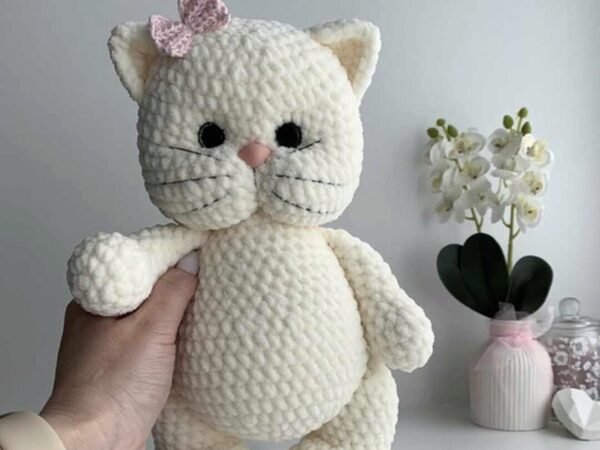Мастер-класс PDF по вязанию игрушки крючком. Кошечка вяжется очень быстро, без пришивных деталей. Пряжи на игрушку требуется минимум, на одну игрушку понадобится всего лишь 25 грамм пряжи. Размер игрушки 12см в длину, в зависимости от пряжи, номера крючка и плотности вязания. Необходимые материалы: