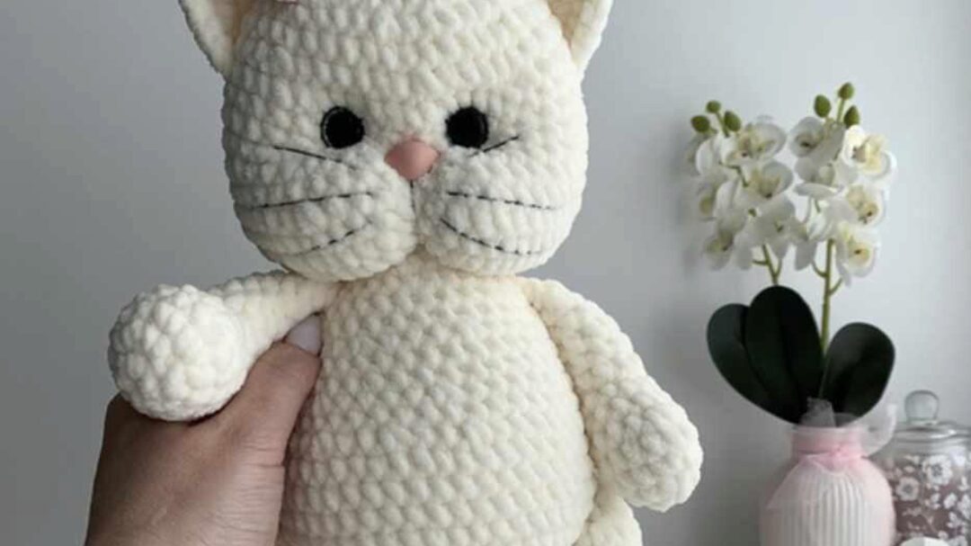 Кошечка Мия. Описание вязания спицами. Все детали вяжем по кругу, кроме ручек. Размер: 21 см.