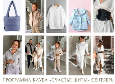 Программа месяца •Пиджак«Брэд» для мужчин и мальчиков •Джинсовая юбка женская «Джулия» •Платье женское «Асель» •Детский костюм «Изабелла» •Женский купальник «Маргарита» •Топ женский трикотажный «Ева» Приглашенные спикеры: •Ева Леман МК «Набор для чаепития» •Архипова Олеса МК «Игольница» •Надежда
